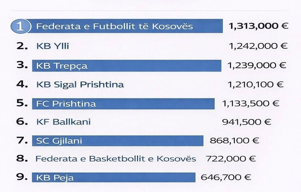 Ndër përfituesit kryesorë janë gjithashtu FC Prishtina, KF Ballkani dhe SC Gjilani, me shifra që variojnë nga 940 mijë deri në mbi 860 mijë euro.
