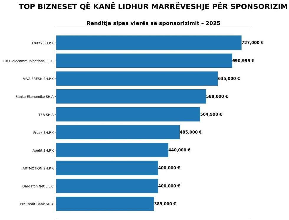 Në anën tjetër, lista e bizneseve sponsorizuese kryesohet nga Frutex me 727,000 euro, e ndjekur nga IPKO me 690,999 euro dhe Viva Fresh me 635,000 euro. Kontribute të rëndësishme kanë dhënë edhe Banka Ekonomike, TEB, ProCredit Bank, si dhe kompani të tjera vendore që kanë investuar qindra mijëra euro në sport.
