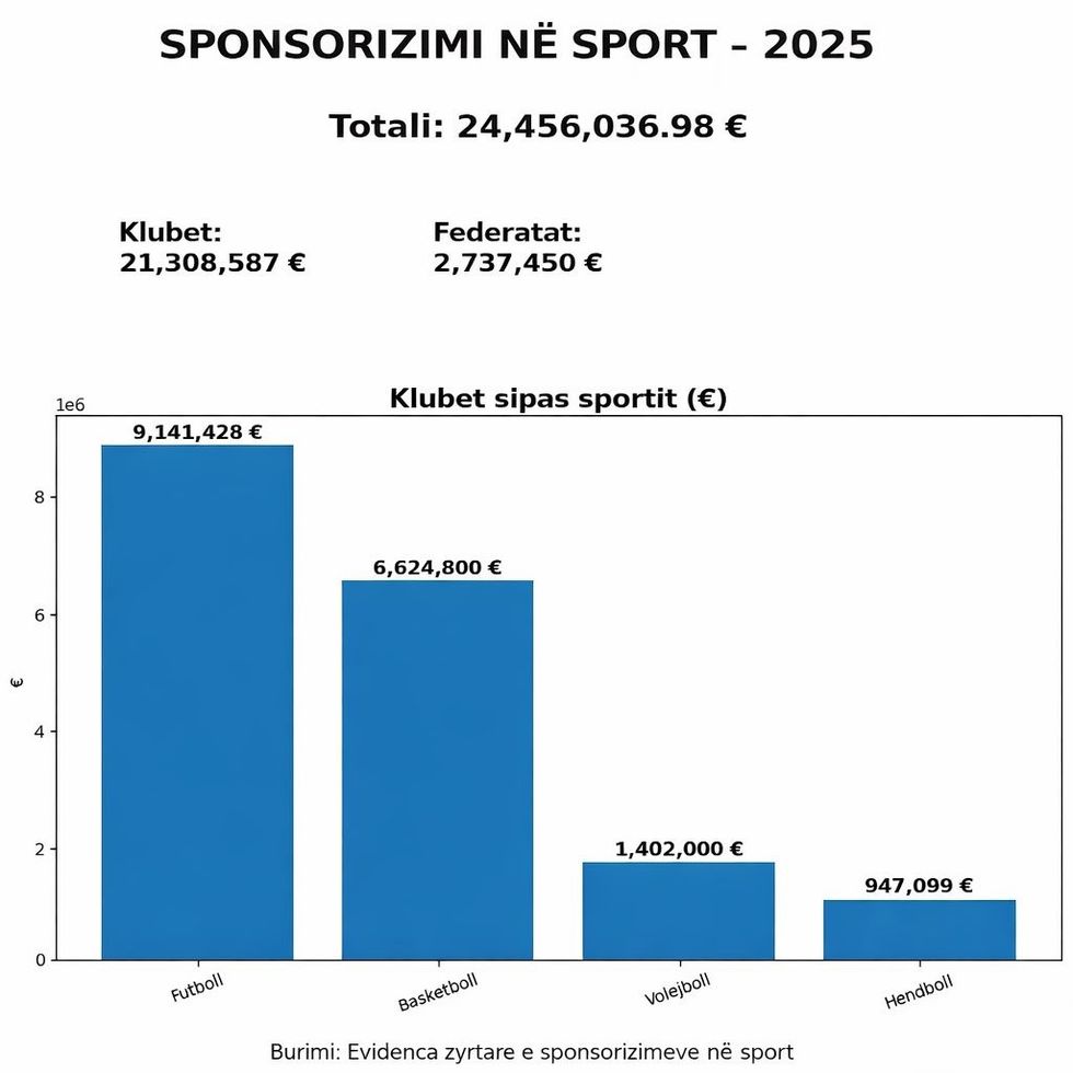 Gjatë vitit 2025, vlera totale e sponsorizimeve në sport në Kosovë ka arritur në 24,456,036.98 euro, duke konfirmuar një trend të qartë rritjeje dhe një rol gjithnjë e më të rëndësishëm të sektorit privat në zhvillimin e sportit.