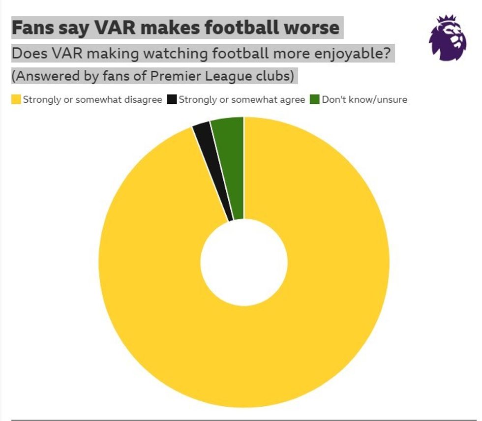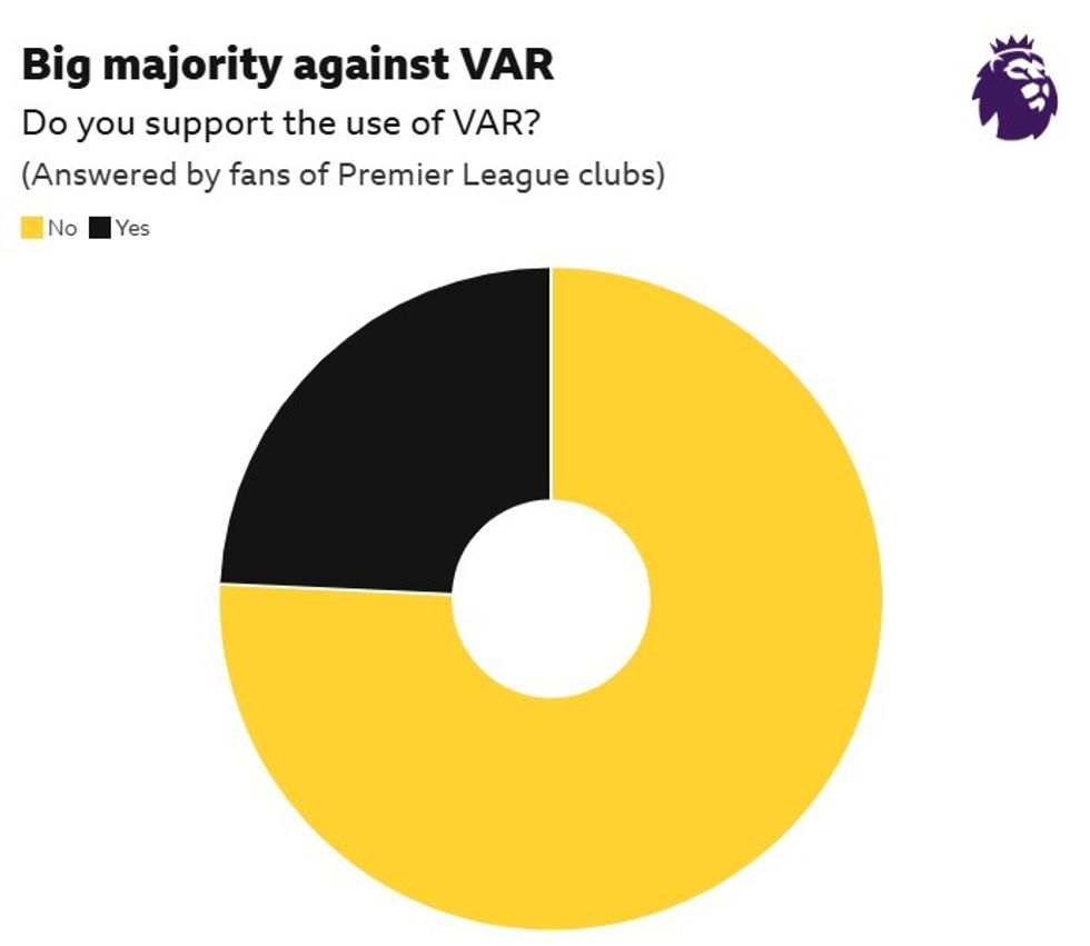 Gati 8 mijë tifozë morën pjesë në sondazh, i cili përfshiu përkrahës nga të 20 skuadrat e elitës këtë sezon. Nga të anketuarit, 90% nuk pajtohen se futja e VAR-it e ka përmirësuar përvojën në stadium, ndërsa 91% besojnë se ka dëmtuar spontanitetin e festimeve të golave.