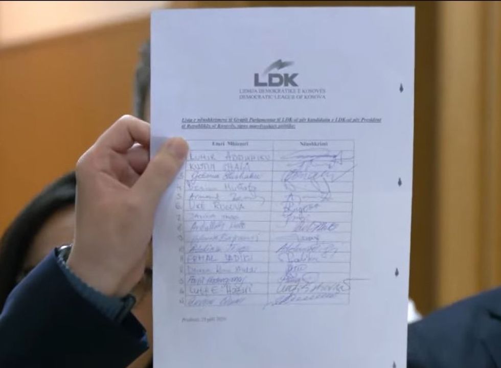 Share Facebook Twitter LinkedIn Pinterest Email Kryetari i Lidhjes Demokratike të Kosovës, Lumir Abdixhiku ka treguar nënshkrimet e tyre për kandidaten për presidente, Vjosa Osmani.