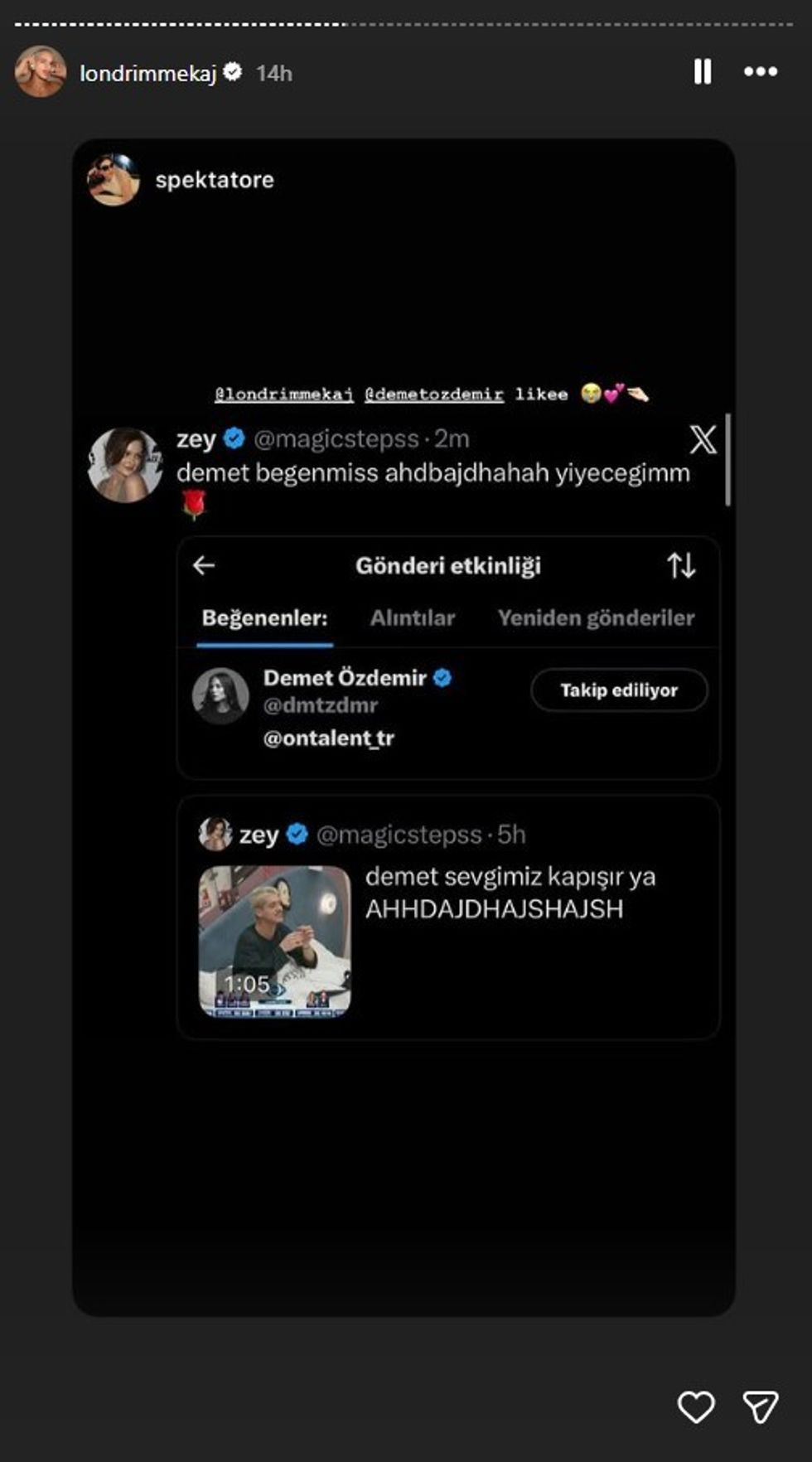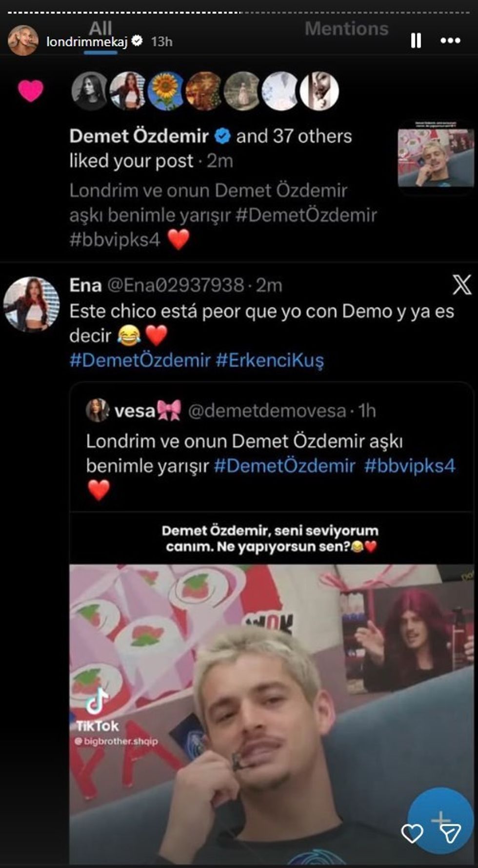 Ajo që surprizoi më shumë ishte reagimi i vetë Demet Ozdemir. Nga llogaria e saj e verifikuar, ajo i bëri “Like” njërit prej postimeve ku Londrimi i shpreh dashurinë, duke treguar se e kishte parë dhe vlerësuar dedikimin e tij.