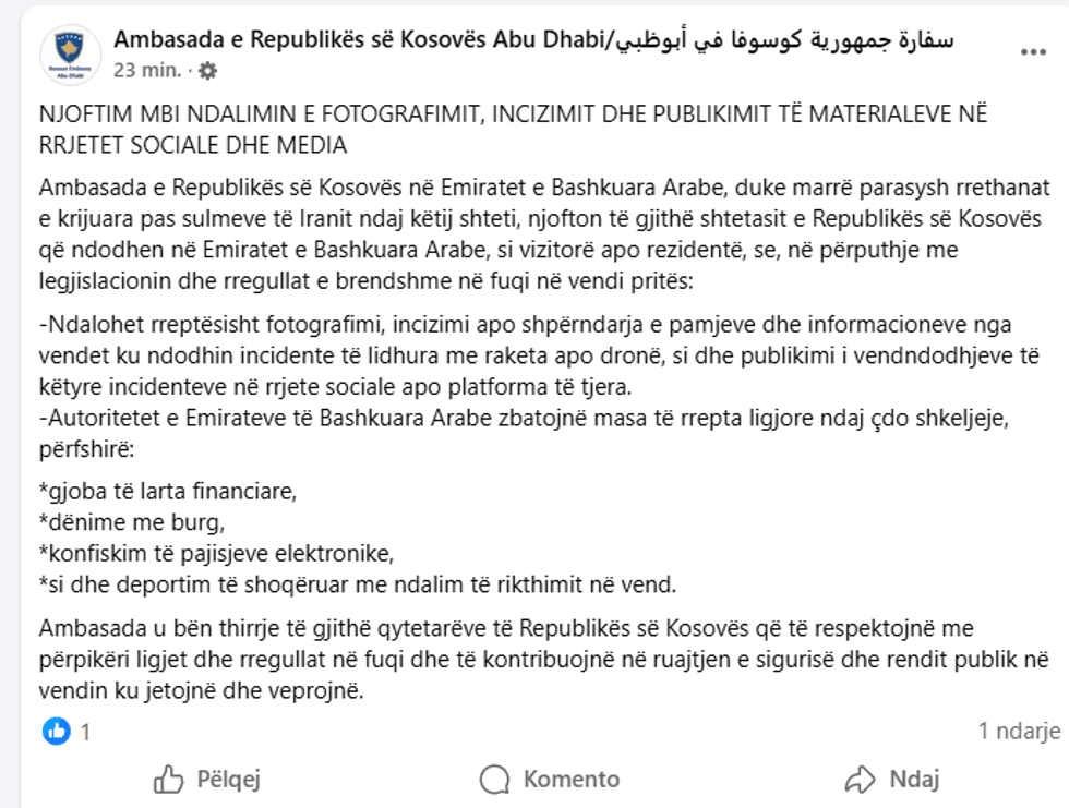 Në njoftim theksohet se, në përputhje me legjislacionin dhe rregullat e brendshme në fuqi në Emiratet e Bashkuara Arabe, ndalohet rreptësisht fotografimi, incizimi apo shpërndarja e pamjeve dhe informacioneve nga vendet ku ndodhin incidente të lidhura me raketa apo dronë.