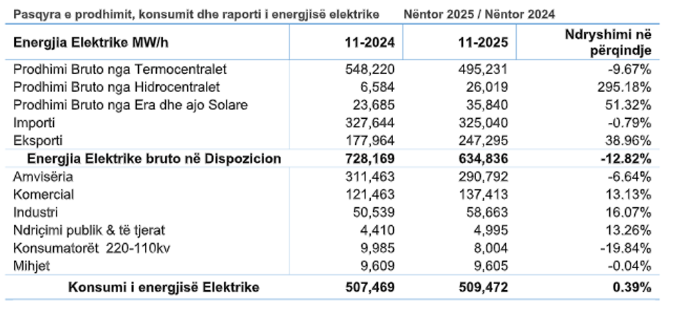“Gjatë muajit nëntor të vitit 2025, energjia elektrike bruto në dispozicion ishte 634.84 GWh, kurse konsumi i energjisë elektrike ishte 509.47 GWh ose 0,39 % më i madh, krahasuar me muajin e njëjtë të vitit paraprak”, thuhet në njoftim.