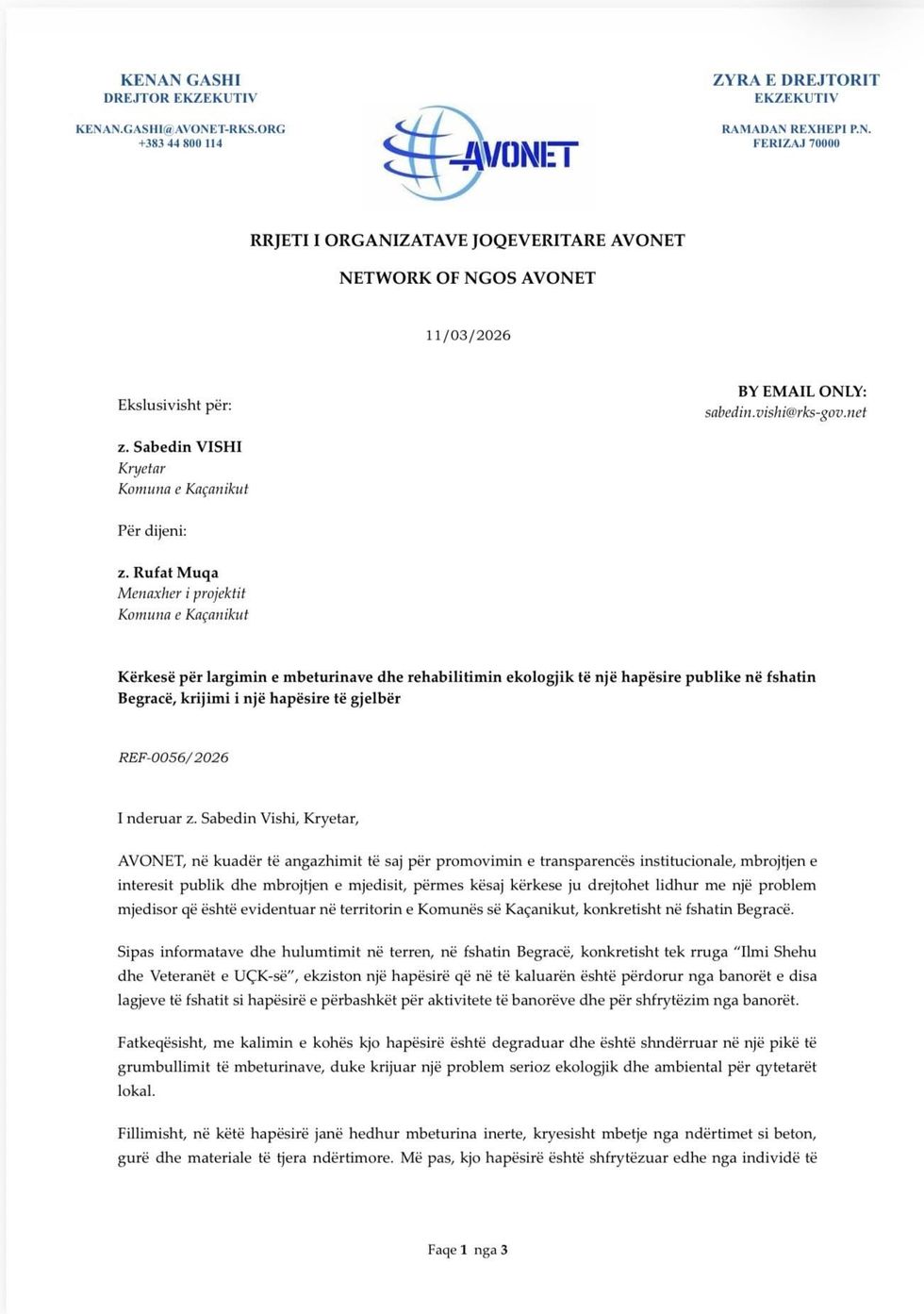 AVONET i është drejtuar Kryetarit të Komunës së Kaçanikut, Sabedin Vishi, me një kërkesë për largimin e mbeturinave dhe rehabilitimin ekologjik të hapësirës publike në rrugën “Ilmi Shehu dhe Veteranët e UÇK-së” në fshatin Begracë, si dhe për krijimin e një hapësire të gjelbër.
