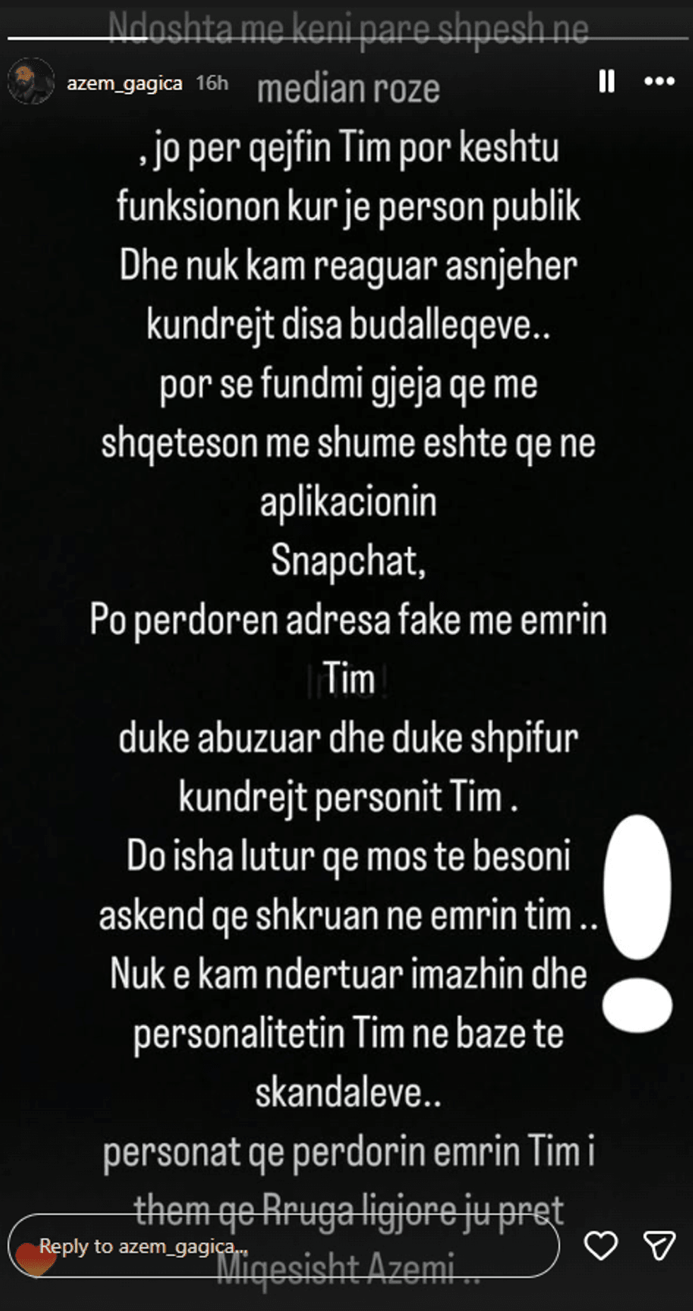 Megjithatë, theksoi se situata e fundit e ka shqetësuar më shumë, pasi në platformën Snapchat, sipas tij, po hapen adresa false në emrin e tij që përdoren për të abuzuar dhe shpifur ndaj të tjerëve.