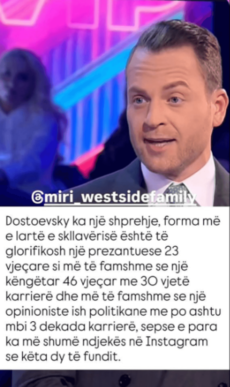 “Forma më e lartë e skllavërisë është të glorifikosh një prezantuese 23-vjeçare si më të famshme se një këngëtar 46-vjeçar me 30 vjet karrierë dhe më të famshme se një opinioniste ish-politikane me mbi tre dekada karrierë, sepse e para ka më shumë ndjekës në Instagram se këta dy të fundit”, tha ndër tjerash duke e përfshirë edhe Monika Kryemadhin.
