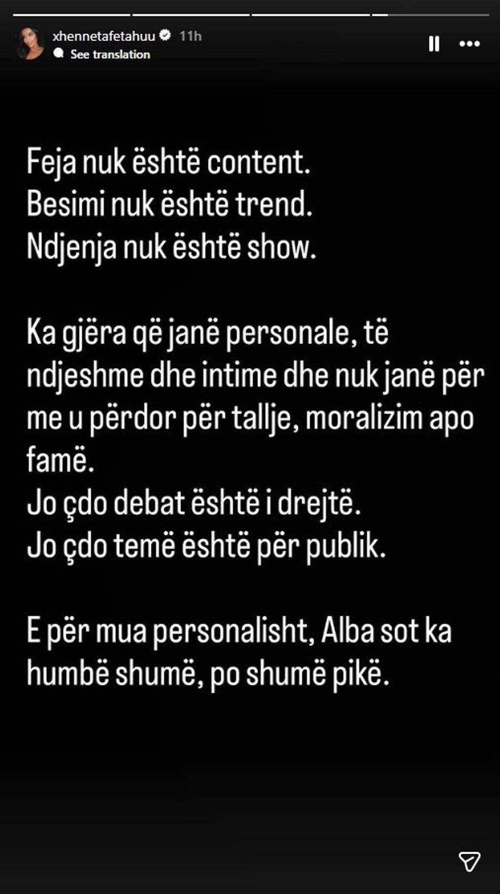 Në deklaratën e saj, Xheneta thekson se çështjet që lidhen me fenë dhe besimin janë shumë personale dhe nuk duhet të kthehen në material për debat televiziv apo në mjet për të tërhequr vëmendje.
