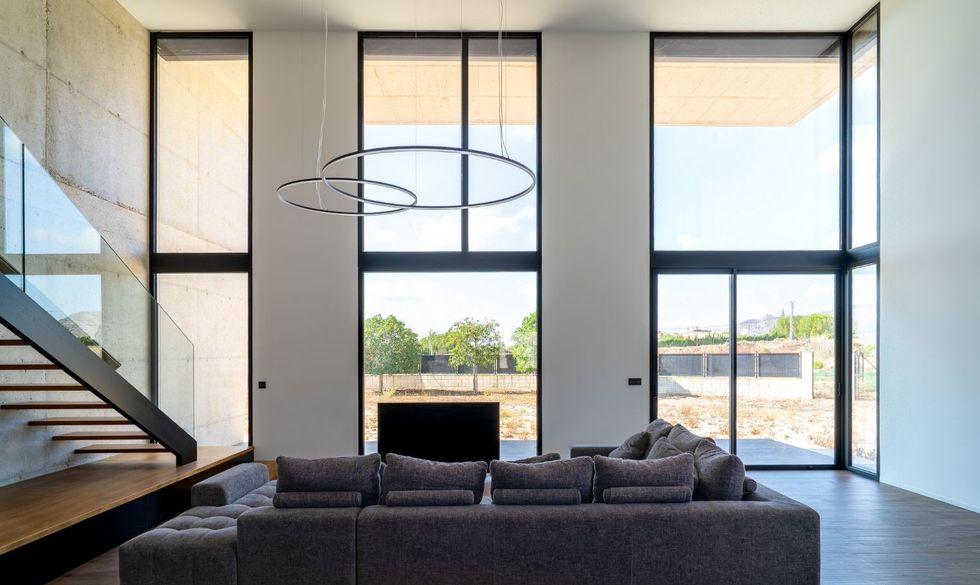 Dritaret e mëdha nga dyshemeja deri në tavan e përforcojnë fasadën, duke kornizuar pamjet e terrenit përreth dhe duke lejuar depërtimin maksimal të dritës natyrale, e cila e zbut karakterin e fortë të materialeve, transmeton Telegrafi.
