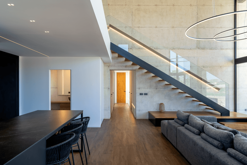 Në brendësi, dizajni vazhdon me të njëjtën qartësi dhe përmbajtje estetike. Hapësira e ndenjës me lartësi të dyfishtë dominohet nga shkallët me parmak xhami dhe hapa druri që duken sikur notojnë, duke krijuar lidhje të pandërprerë vizuale mes kateve.