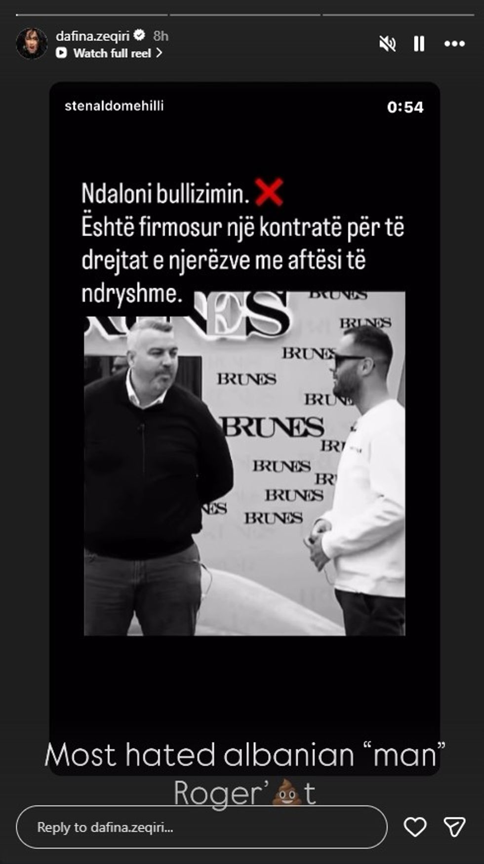 Në reagimin e saj përmes Instastory, Afina nuk ka kursyer fjalët, duke e cilësuar Rogertin si “mashkullin” më të urryer shqiptar.