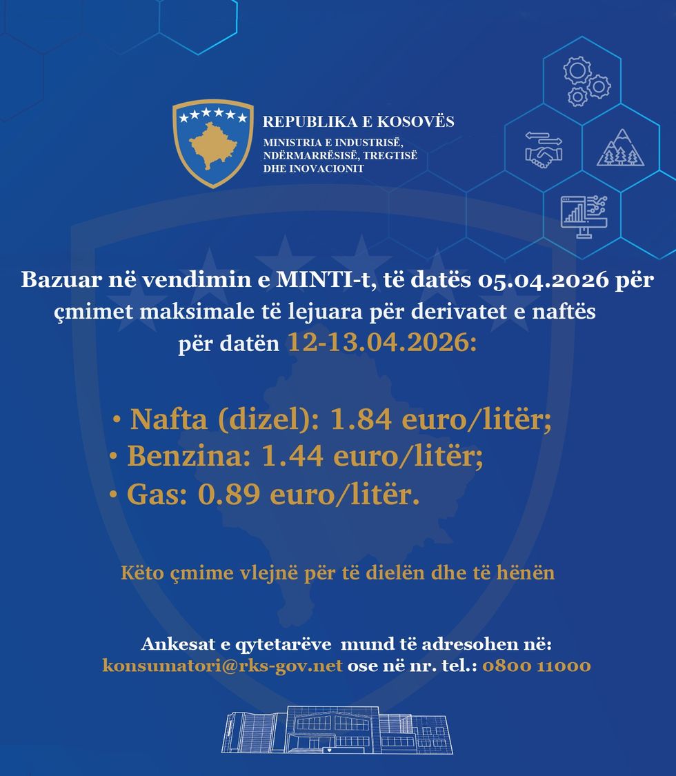 Çmimi i naftës (dizelit) është caktuar në 1.84 euro për litër. Po ashtu, benzina është vendosur në 1.44 euro për litër, ndërsa gazi në 0.89 euro për litër.