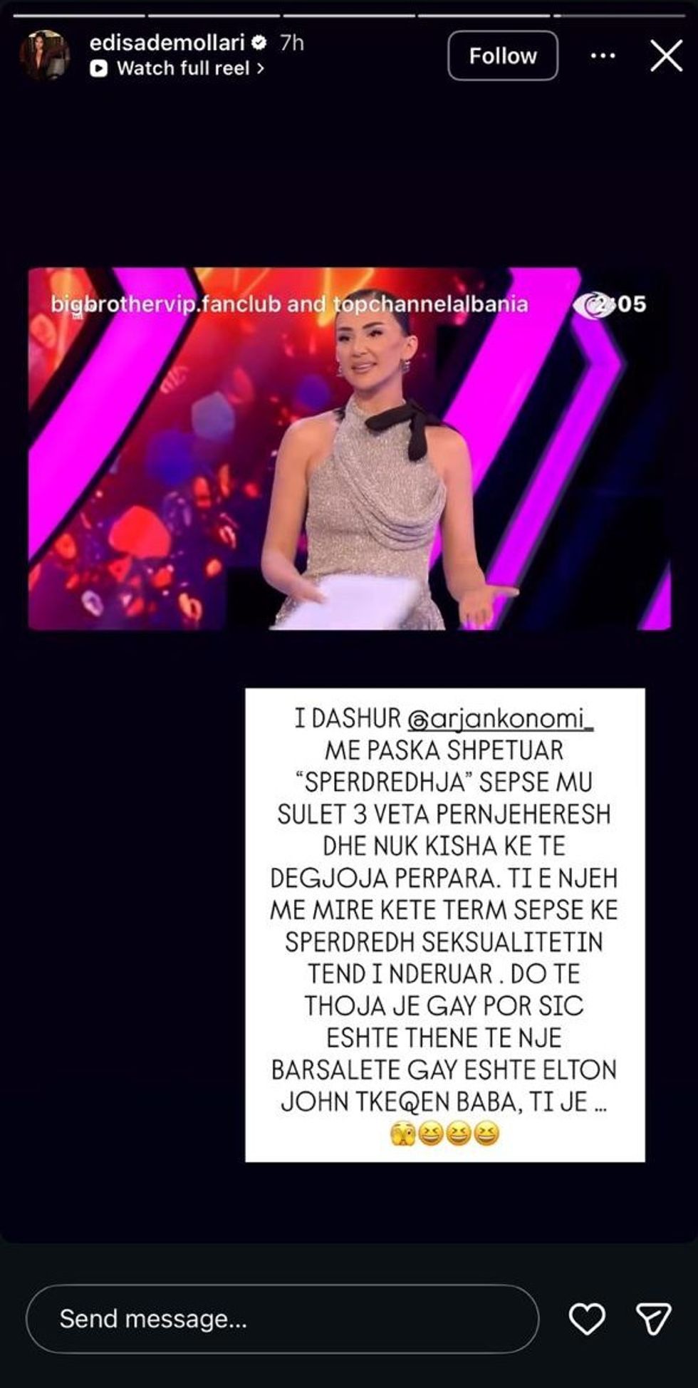Përmes një Instagram Story, Edisa ka përdorur tone të ashpra dhe ironike, duke e sulmuar opinionistin me akuza personale. Ajo shkruan: