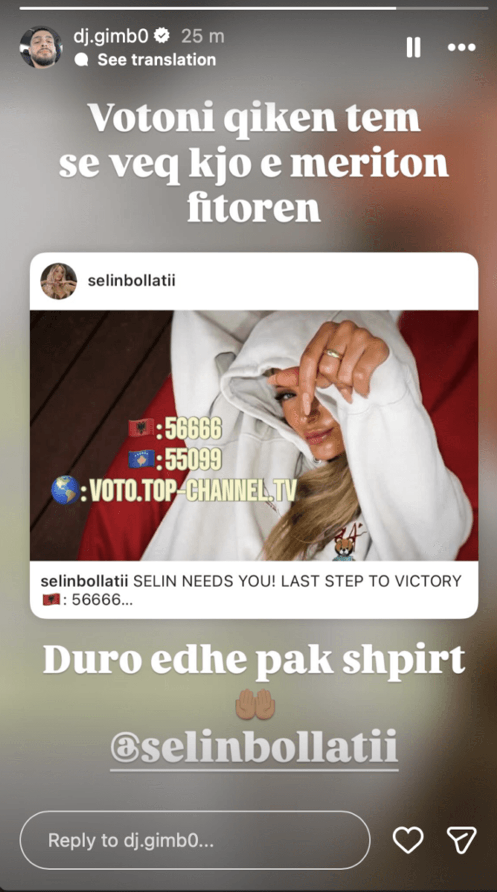 Përveç thirrjes për votë, ai ka ndarë edhe një mesazh më emocional, duke i dhënë kurajo Selinit për ditët e fundit të garës.