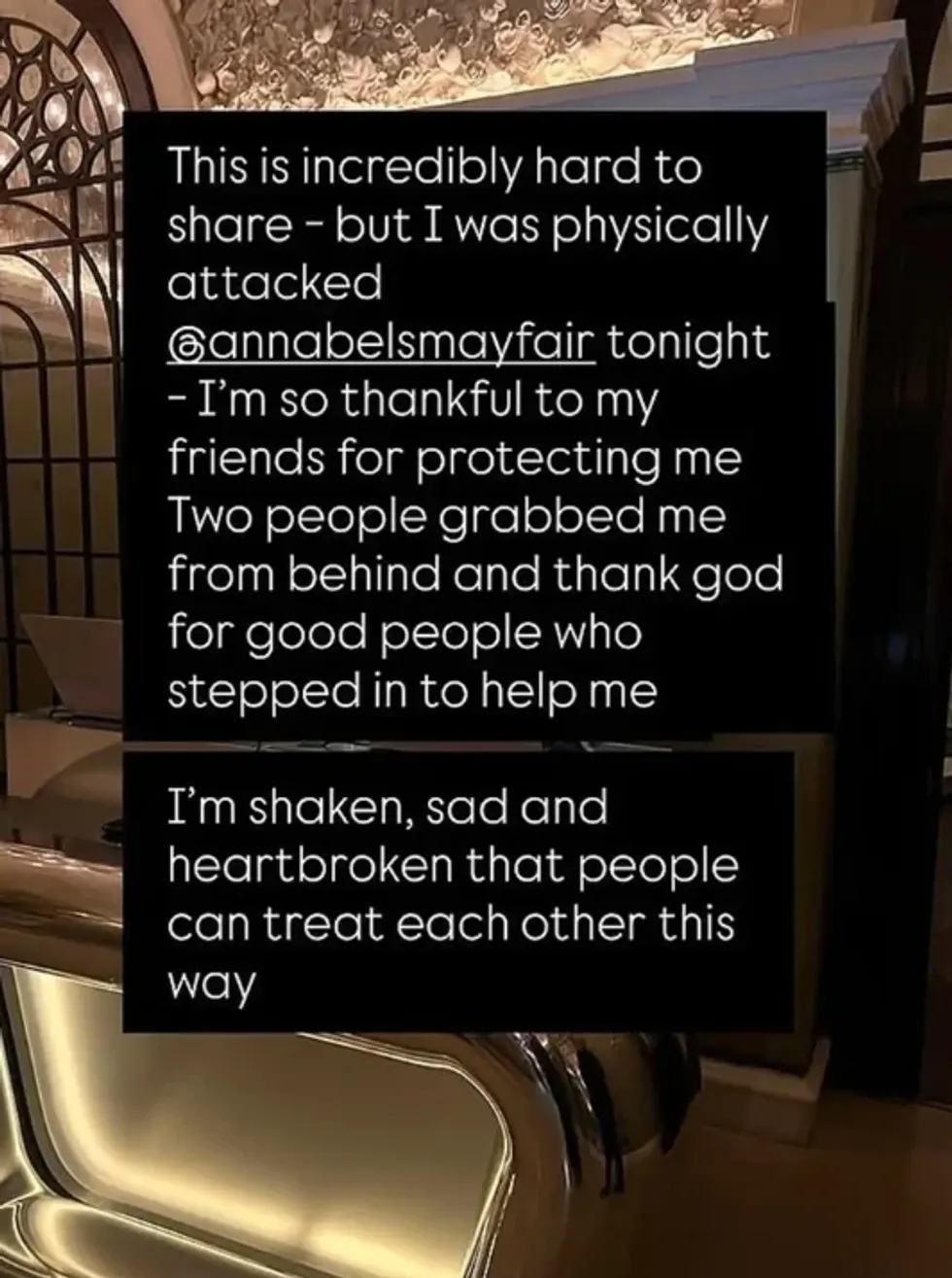 “Është vërtet e vështirë për t’u ndarë me të, por sonte u sulmova fizikisht. Jam mirënjohëse ndaj miqve të mi që më mbrojtën. Jam mirënjohëse ndaj njerëzve të mirë që më erdhën në ndihmë. Jam e shokuar, e trishtuar dhe me zemër të thyer që njerëzit sillen me njëri-tjetrin në këtë mënyrë”, tha ajo.