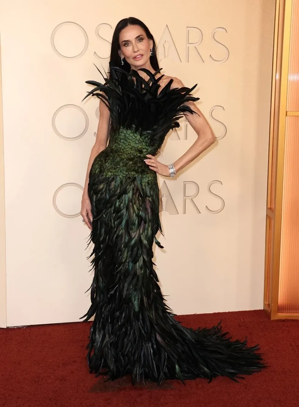 Ndër figurat që tërhoqën më shumë vëmendje ishte Demi Moore, e cila u konsiderua sërish një nga “mbretëreshat” e mbrëmjes. Ajo u shfaq me një fustan origjinal Gucci të zbukuruar me pupla, një stil që i përshtatet prirjes së saj për elegancë me nota ekstravagante.