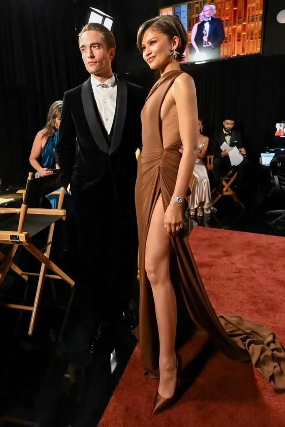 Zendaya u shfaq gjithashtu me një fustan Louis Vuitton, duke rikujtuar fuqinë e ngjyrës kafe dhe duke bërë një referencë stilistike ndaj fustanit të famshëm që Angelina Jolie kishte veshur në Oscars në vitin 2012.