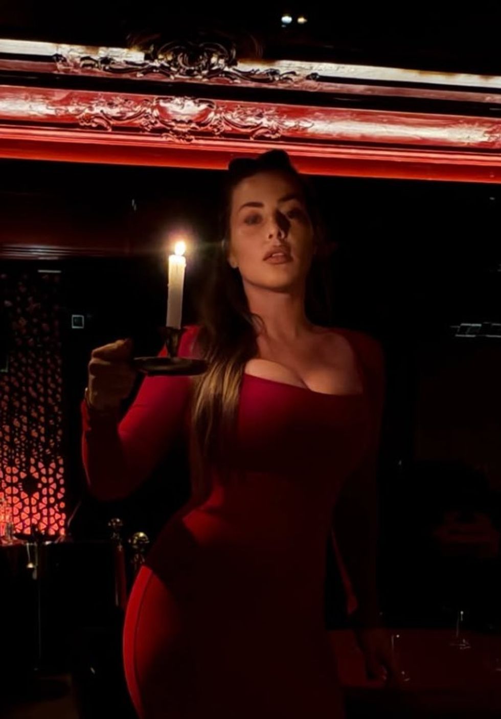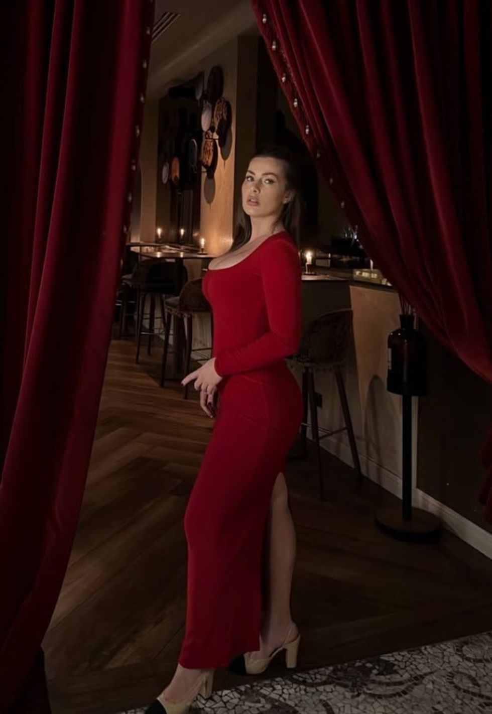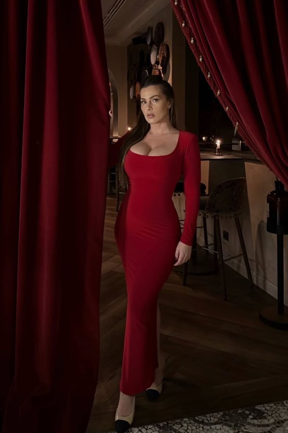Në imazhet e shpërndara, Olta shfaqet në një ambient elegant restoranti, e veshur me një fustan të kuq nga marka e saj, që i thekson linjat trupore dhe elegancën.