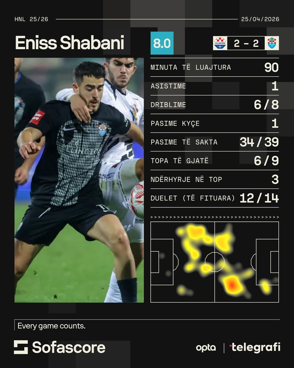 Jo vetëm në fazën ofensive, por edhe në mbrojtje ai ishte vendimtar. Shabani fitoi 12 nga 14 duele dhe realizoi disa ndërhyrje kyçe, duke ndihmuar ekipin të ruajë ekuilibrin në një ndeshje të vështirë.