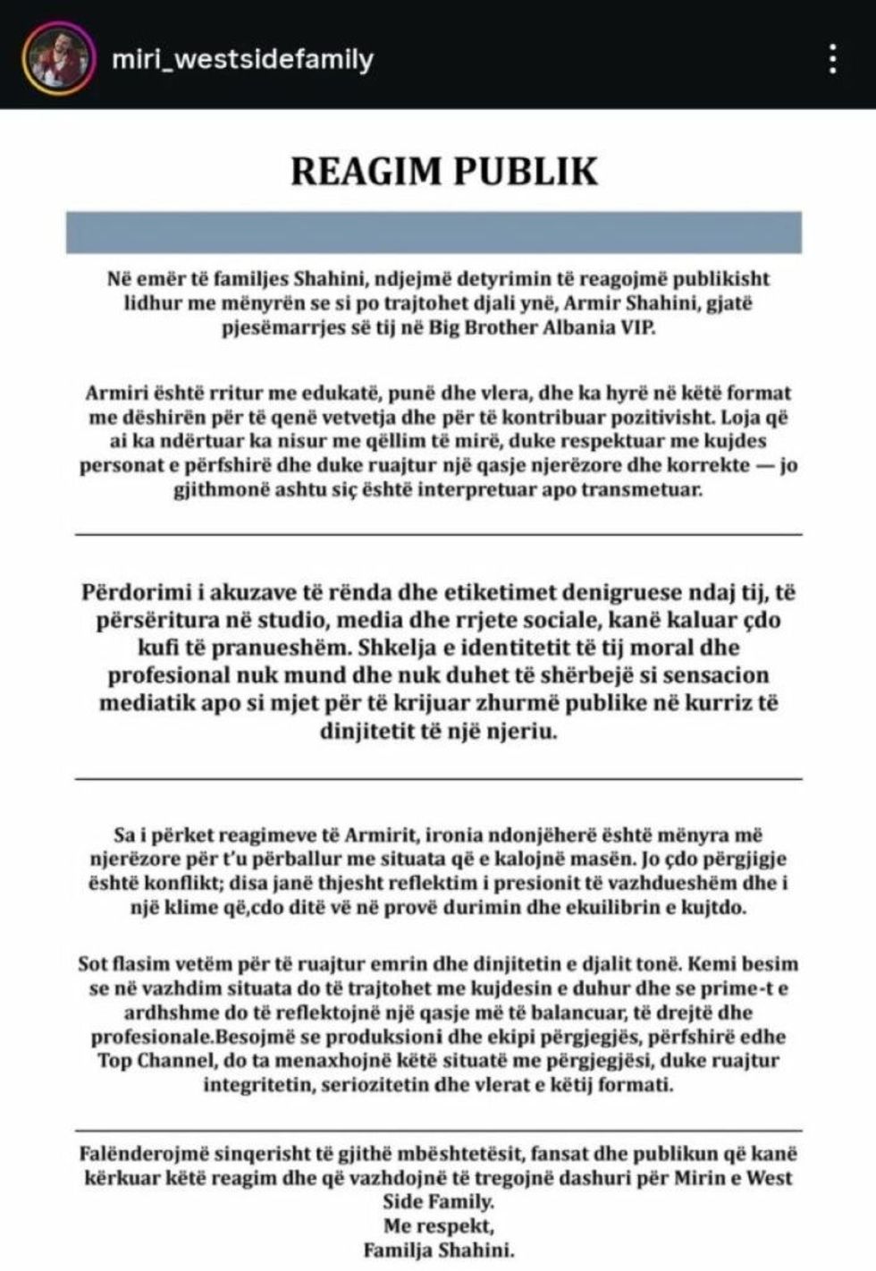 Familjarët e Armir Shahinit kanë publikuar një reagim zyrtar në Instagram lidhur me trajtimin e tij gjatë pjesëmarrjes në Big Brother Albania VIP.