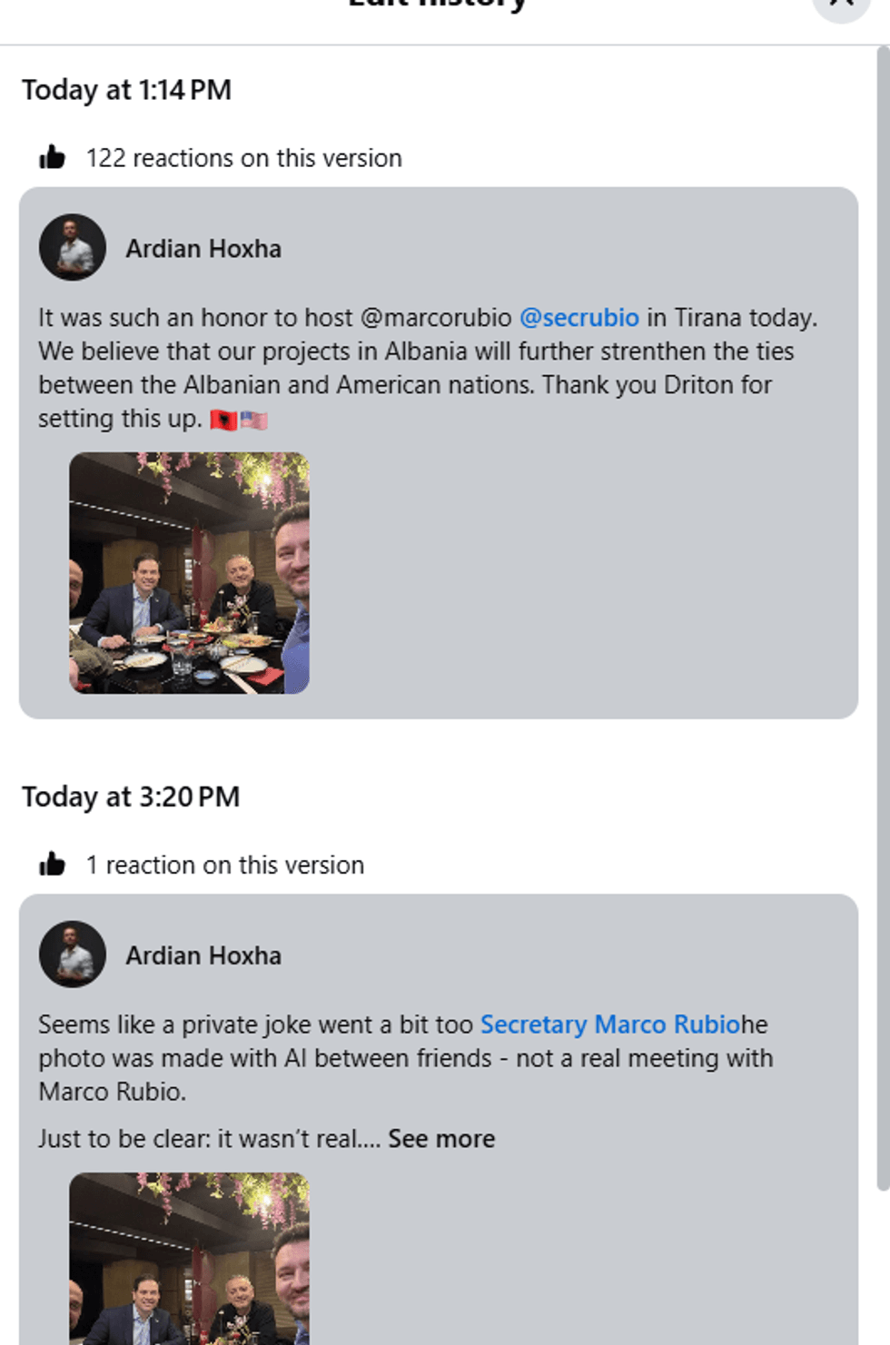 E plotësuar: Biznesmeni shqiptar Ardian Hoxha ka sqaruar se fotografia që qarkulloi në rrjete sociale me sekretarin amerikan Marco Rubio nuk ka qenë reale, por e krijuar me inteligjencë artificiale.