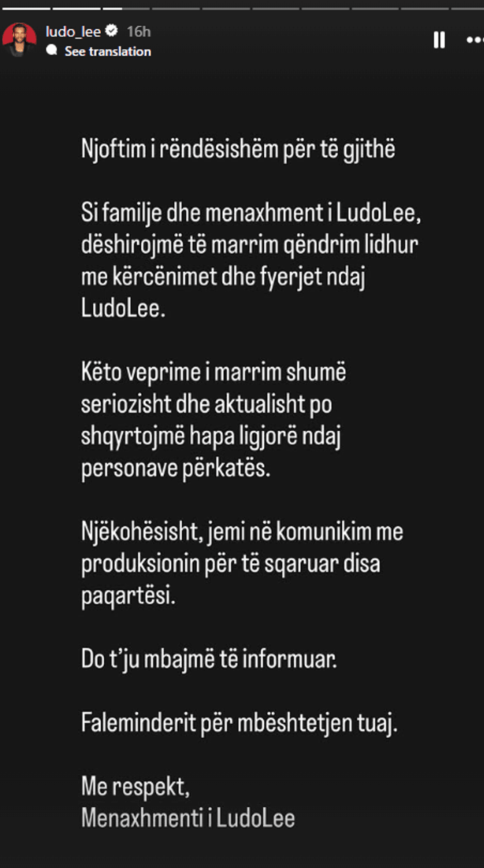 Njoftim i rëndësishëm për të gjithëSi familje dhe menaxhment i Ludo Lee, dëshirojmë të marrim qëndrim lidhur me kërcënimet dhe fyerjet ndaj Ludo Lee.