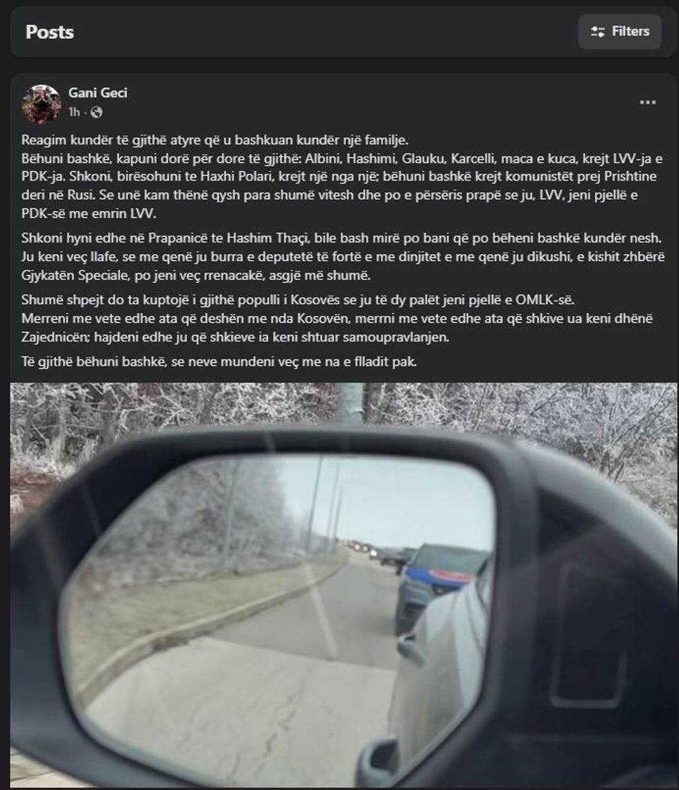 “Bëhuni bashkë, kapuni dorë për dore të gjithë: Albini, Hashimi, Glauku… LVV-ja e PDK-ja… ju jeni pjellë e PDK-së me emrin LVV”, ka shkruar Geci në postim.