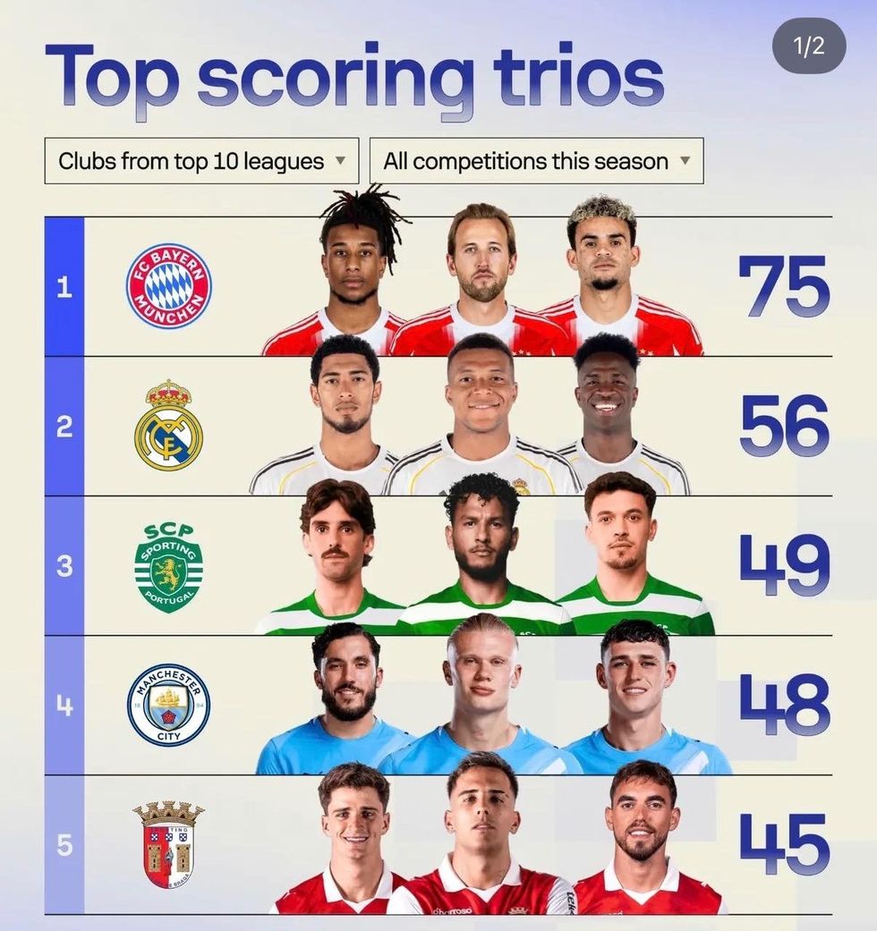 Sipas të dhënave të publikuara nga SofaScore, pesë skuadra evropiane kanë ndërtuar treshet sulmuese më efikase të sezonit deri tani, duke dominuar me numër golash në garat respektive.