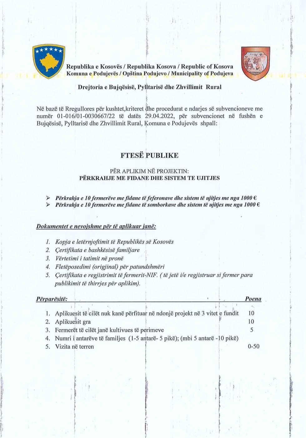 Thirrja është publikuar nga Drejtoria e Bujqësisë, Pylltarisë dhe Zhvillimit Rural e Kosovë, duke u bazuar në rregulloren për ndarjen e subvencioneve në këtë sektor. Përmes këtij projekti parashihet mbështetja e fermerëve me fidane dhe sisteme të ujitjes në vlerë prej 1000 euro për përfitues.