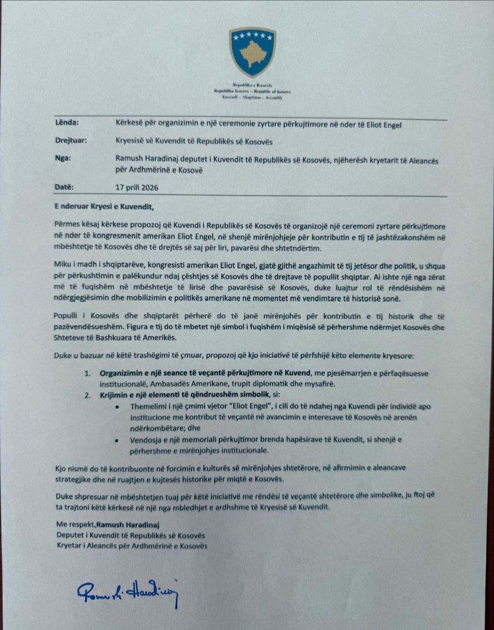 Sipas propozimit, kërkohet mbajtja e një seance të veçantë përkujtimore në Kuvend, krijimi i një çmimi vjetor “Eliot Engel”, si dhe vendosja e një memoriali të përhershëm brenda hapësirave të institucionit.