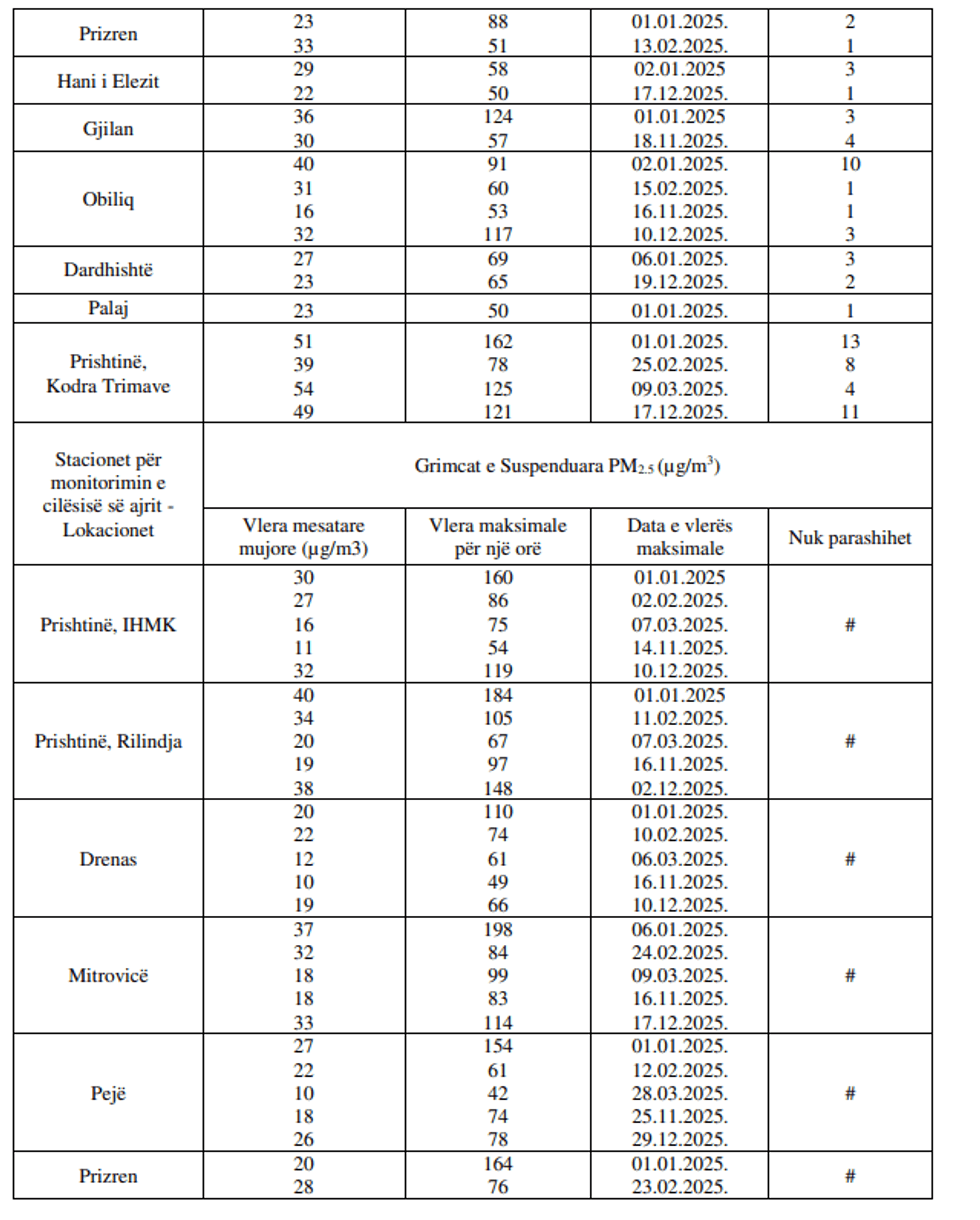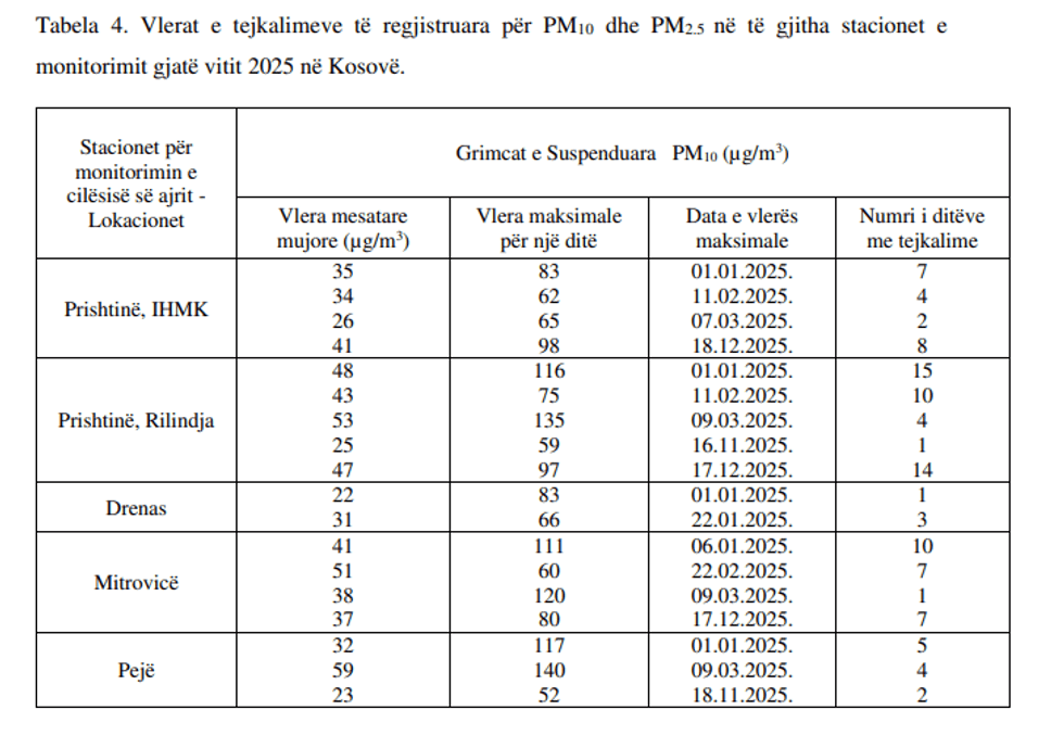 Sipas IKSHPK-së, tejkalime të vazhdueshme të grimcave PM10 janë regjistruar gjatë muajve janar, shkurt, nëntor dhe dhjetor të vitit 2025 në pothuajse të gjitha stacionet e monitorimit, duke vënë në pah nevojën urgjente për ndërhyrje sistematike.