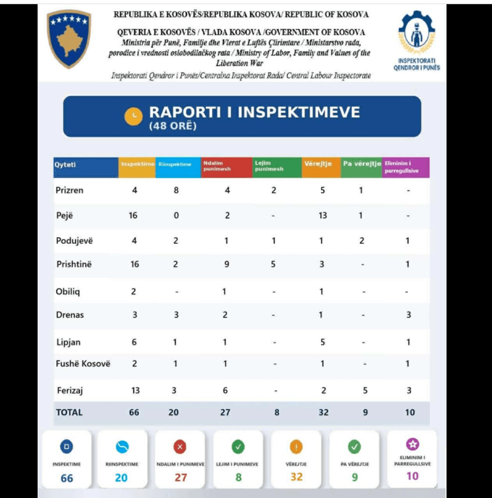 Sipas përditësimeve nga Inspektorati, brenda 48 orëve të fundit janë bërë 66 inspektime në Prizren, Pejë, Prishtinë, Podujevë, Obiliq, Drenas, Lipjan, Fushë Kosovë dhe Ferizaj.
