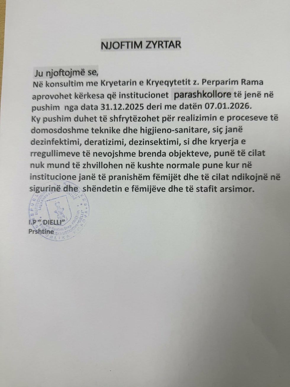 Vendimi u mor pas aprovimit nga kryetari i Prishtinës, Perparim Rama, i cili miratoi kërkesën për pushim të përkohshëm të kopshteve dhe çerdheve, përcjell Telegrafi.