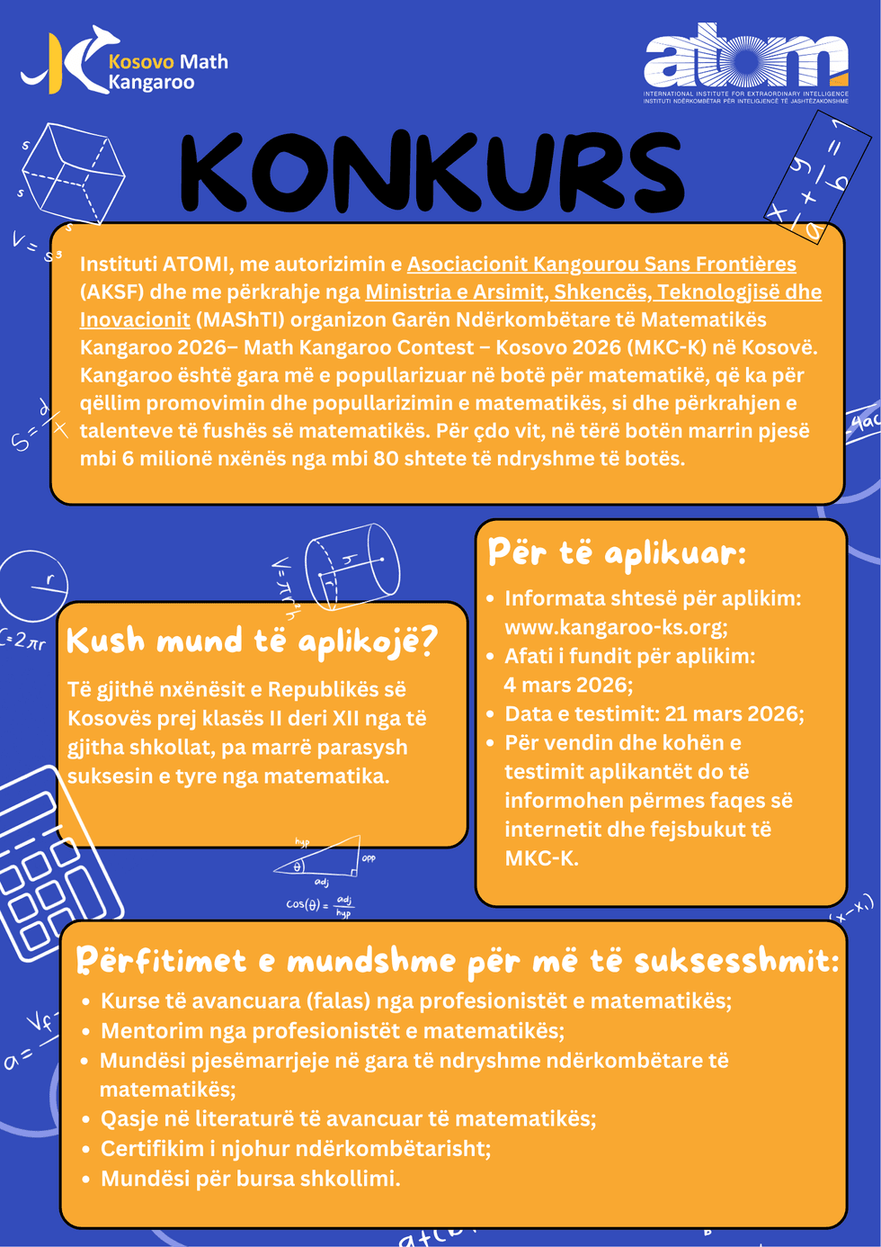 Instituti ATOMI, me autorizimin e Asociacionit Kangourou Sans Frontières (AKSF) dhe me përkrahje nga Ministria e Arsimit, Shkencës, Teknologjisë dhe Inovacionit (MAShTI) organizon për të dhjetën herë Garën Ndërkombëtare të Matematikës Kangaroo 2026 – Math KangarooContest – Kosovo 2026 (MKC-K) në Kosovë.
