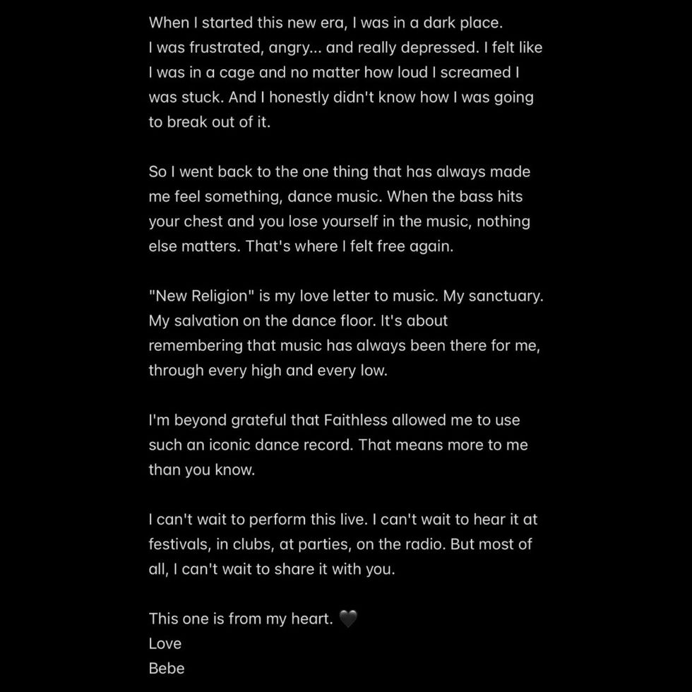 “Kështu që iu ktheva të vetmes gjë që gjithmonë më ka bërë të ndiej diçka: muzikës dance. Kur basi godet në gjoks dhe ti humb veten në muzikë, asgjë tjetër nuk ka rëndësi. Aty u ndjeva përsëri e lirë”, ka rrëfyer Bebe.