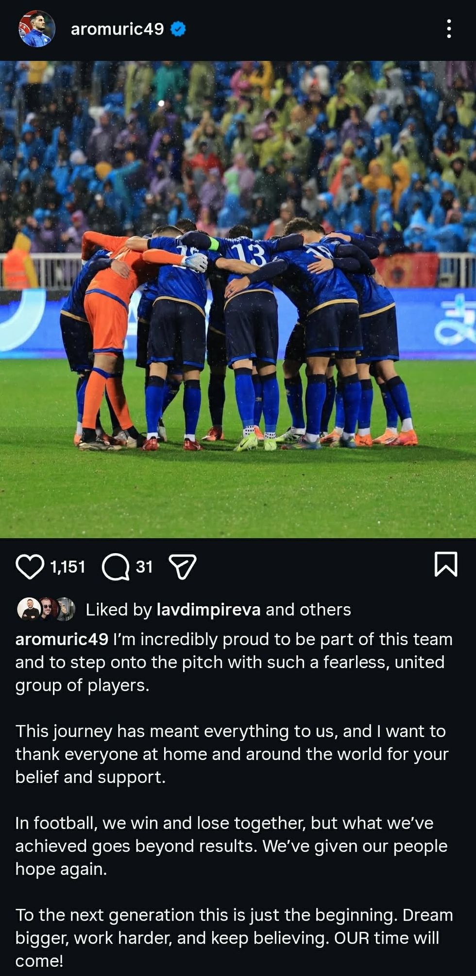 “Për gjeneratën e ardhshme – ky është vetëm fillimi. Ëndërroni më shumë, punoni më fort dhe vazhdoni të besoni. Koha jonë do të vijë!”, ka shkruar Muric në profilin e tij në Instagram. /Telegrafi/