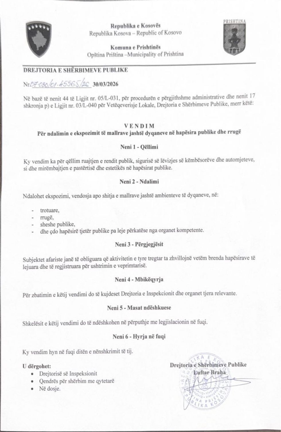 Komuna e Prishtinës ka marrë vendim për ndalimin e ekspozimit të mallrave jashtë dyqaneve, në hapësira publike dhe në rrugë, me qëllim ruajtjen e rendit, sigurisë dhe lirimit të qarkullimit për qytetarët.