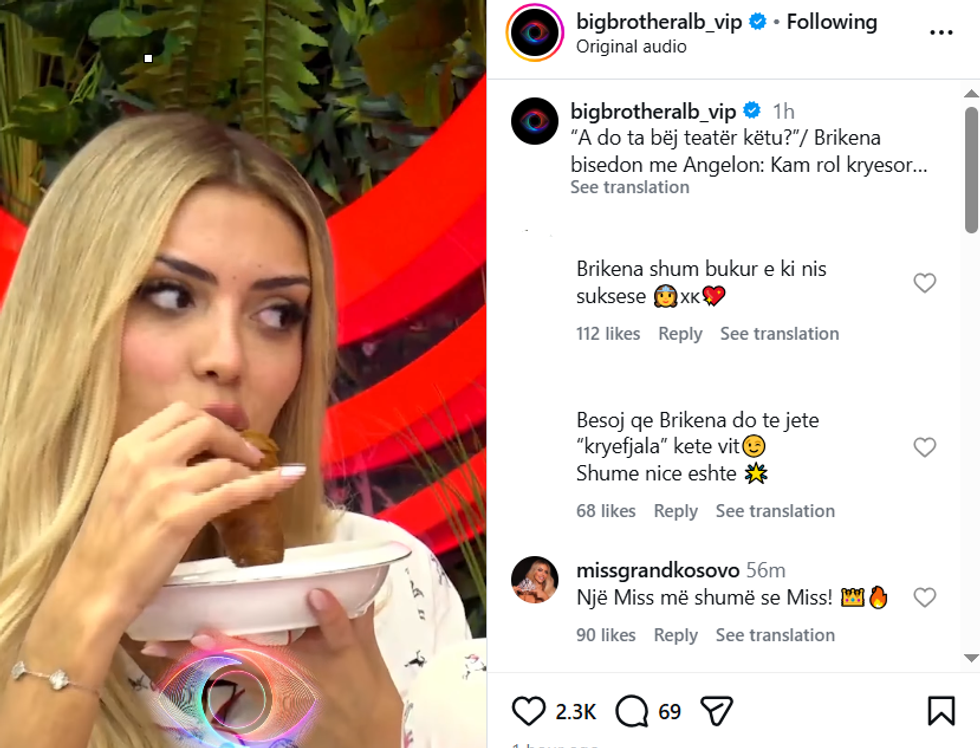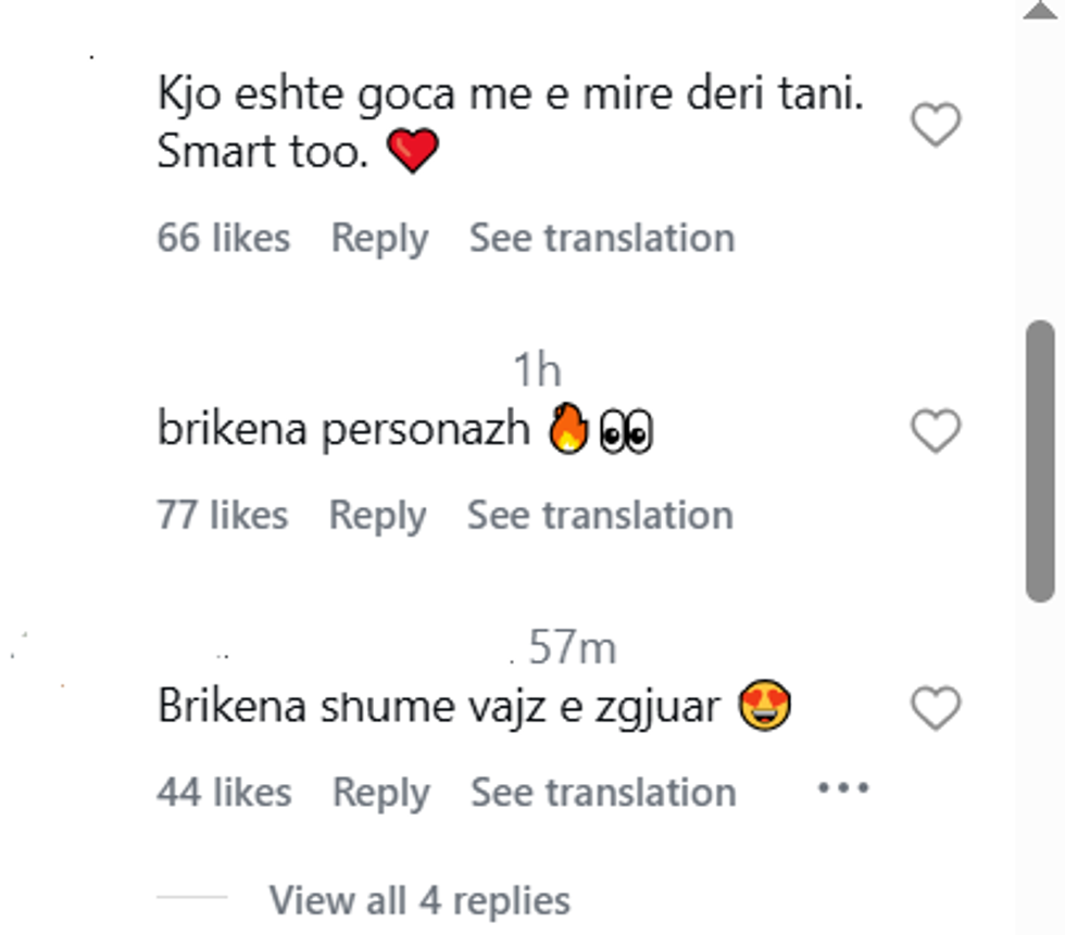 Ndjekësit nuk kanë kursyer komplimente dhe komentet pozitive: “Shumë bukur e ke nisur”, “Besoj që Brikena do të jetë kryefjala këtë vit”, “Kjo është goca më e mirë deri tani”, “Brikena personazh” etj.