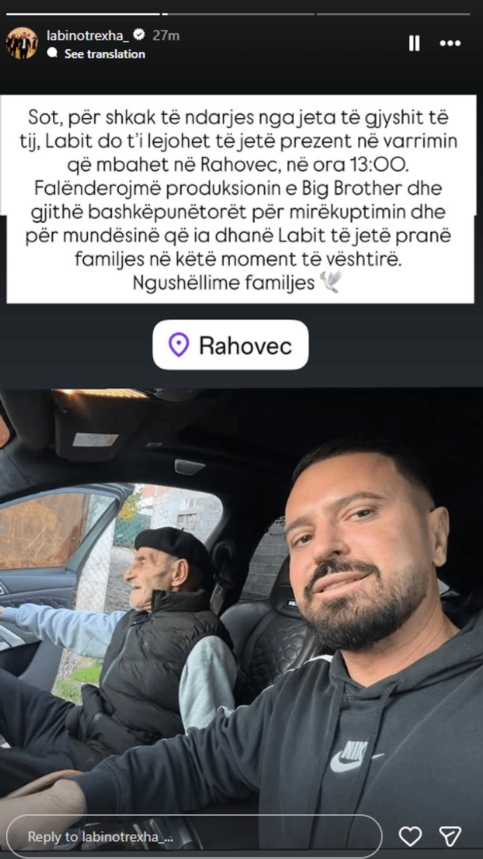 Falënderojmë produksionin e Big Brother dhe gjithë bashkëpunëtorët për mirëkuptimin dhe mundësinë që ia dhanë Labit të jetë pranë familjes në këtë moment të vështirë”. /Telegrafi/