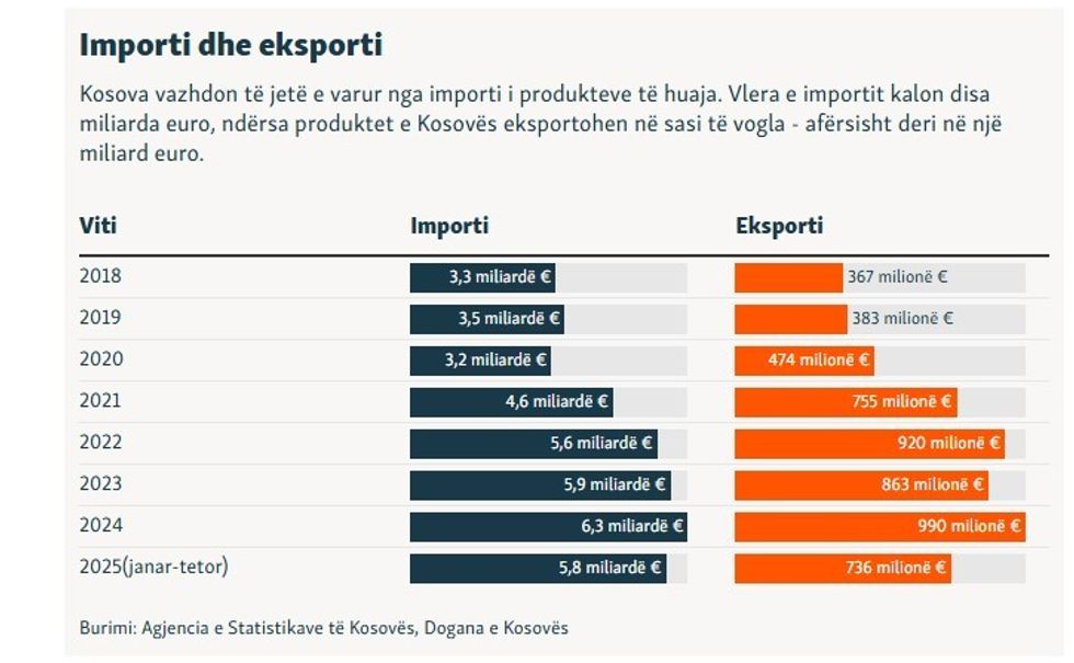 Kosova, me një deficit tregtar të lartë – eksportet rreth 942 milionë euro dhe importet mbi 7 miliardë euro – rrezikon konkurrueshmërinë e industrisë së saj në rajon dhe në tregjet ndërkombëtare, nëse kostot e larta të energjisë vazhdojnë të ngadalësojnë prodhimin dhe të minojnë eksportet.