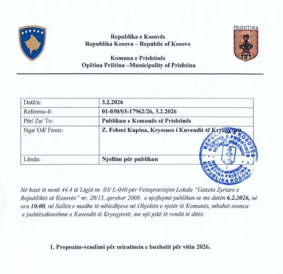 Pika e vetme e rendit të ditës në këtë seancë të jashtëzakonshme është shqyrtimi dhe miratimi i buxhetit komunal për vitin 2026, dokument kyç për funksionimin financiar dhe realizimin e projekteve të planifikuara nga Komuna e Prishtinës.