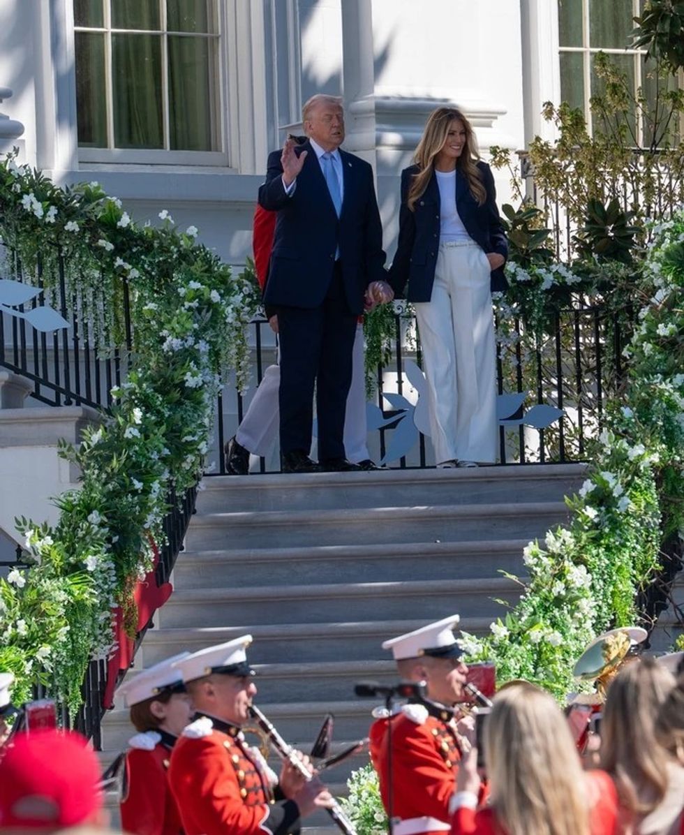 Dizajni dhe sofistikimi i shtëpisë së modës Ralph Lauren dallohen menjëherë. Për festimin e Pashkëve, Melania Trump zgjodhi një kombinim elegant dhe praktik: pantallona në ngjyrë fildishi me bel të lartë, një bluzë të bardhë të thjeshtë dhe një xhaketë “mornare” me xhepa të dyfishtë. Rripi theksoi më tej belin, ndërsa hapat me këpucë të sheshta me majë katrore, me gjasë, ishin shumë të rehatshme.