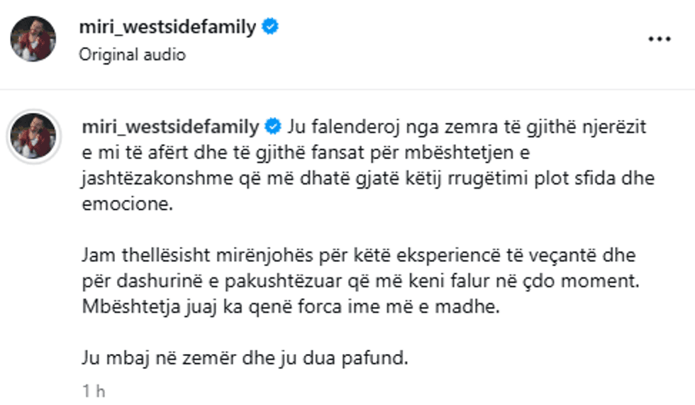 “Jam thellësisht mirënjohës për këtë eksperiencë të veçantë dhe për dashurinë e pakushtëzuar që më keni falur në çdo moment. Mbështetja juaj ka qenë forca ime më e madhe. Ju mbaj në zemër dhe ju dua pafund”, ka potencuar artisti.