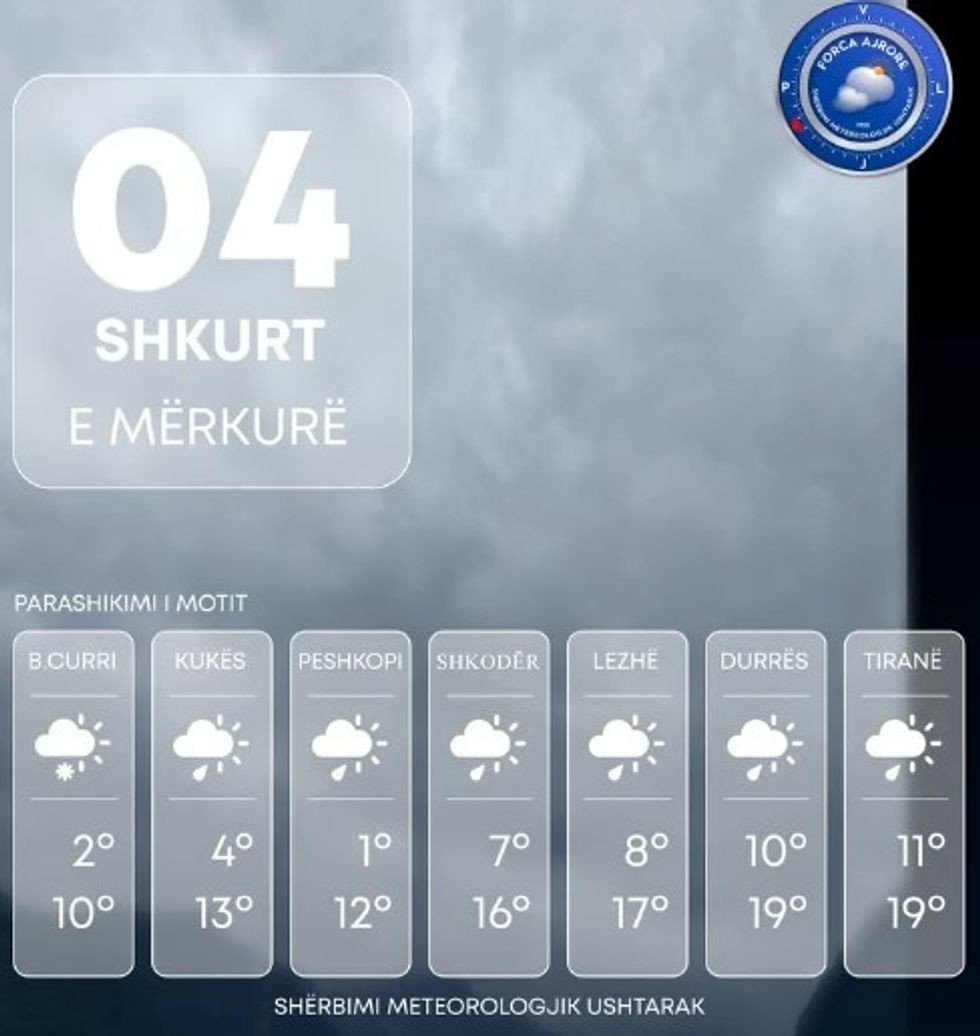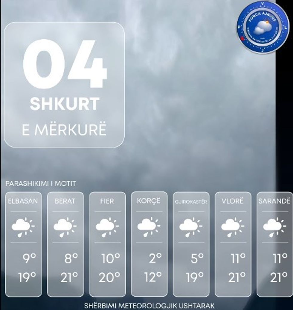 Shërbimi Meteorologjik Ushtarak bën të ditur se Shqipëria të mërkurën ndikohet nga kushte atmosferike të paqëndrueshme.
