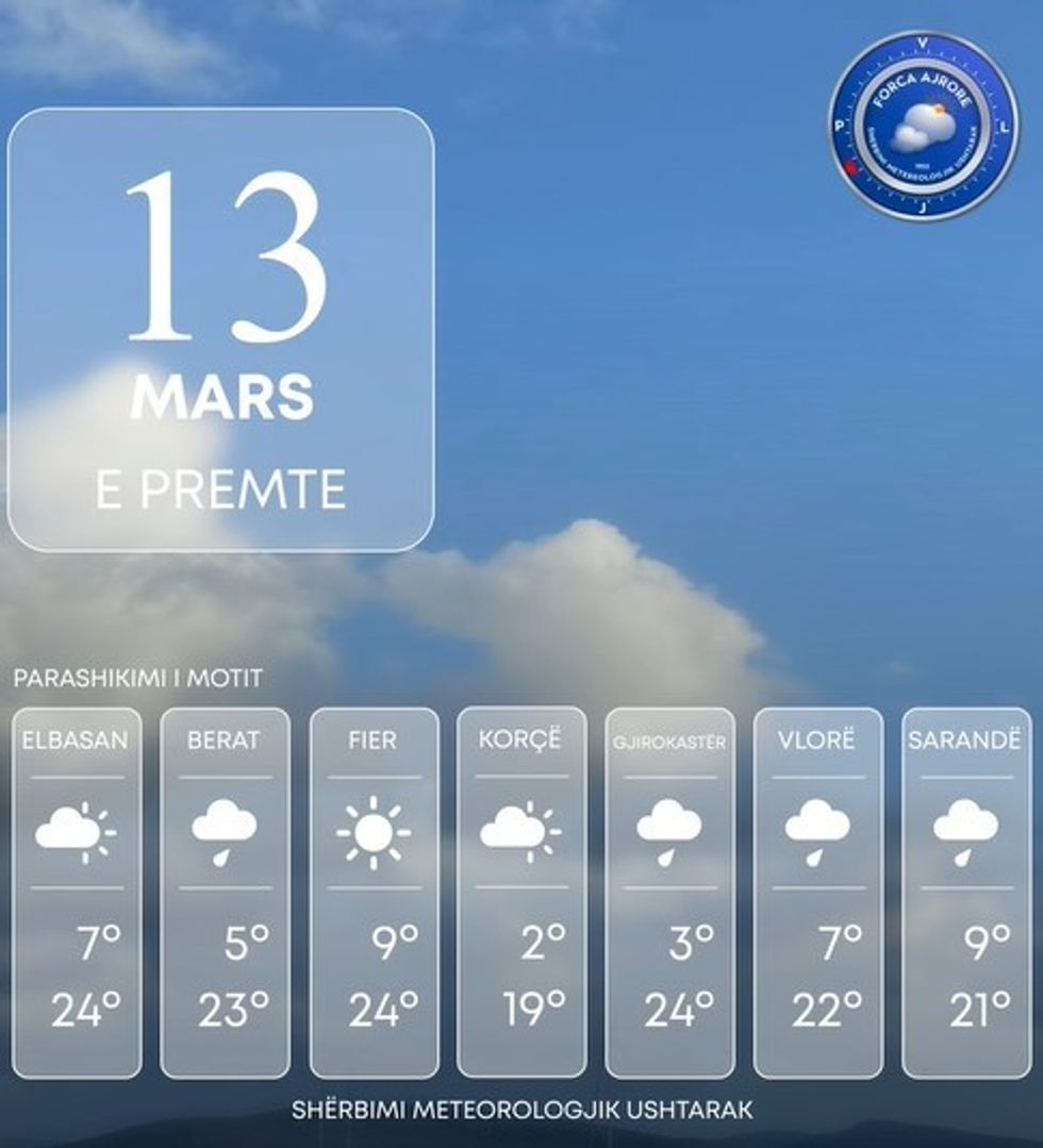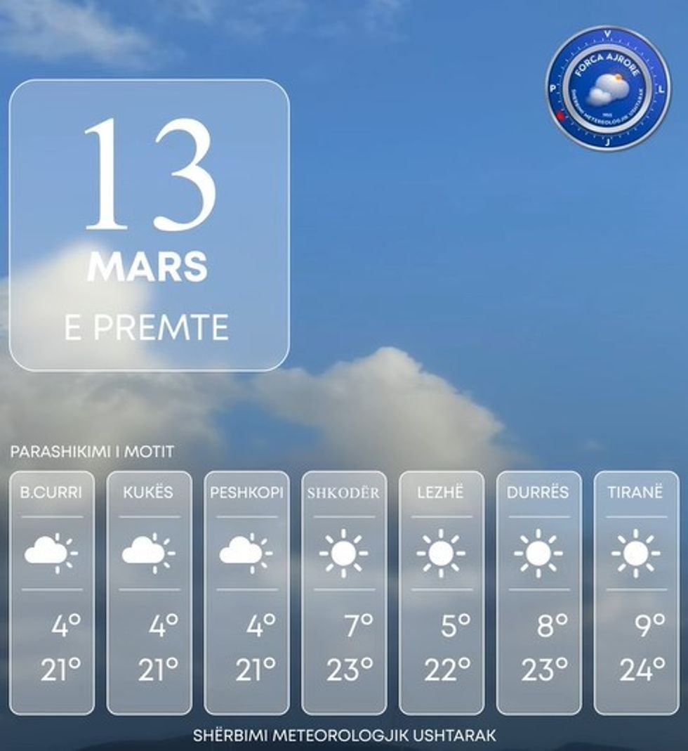 Shërbimi Meteorologjik Ushtarak bën të ditur se moti parashikohet me kthjellime e alternime vranësirash deri mesatare.