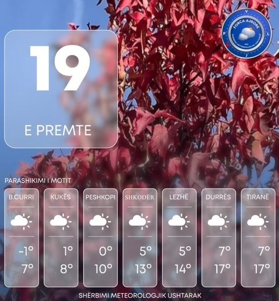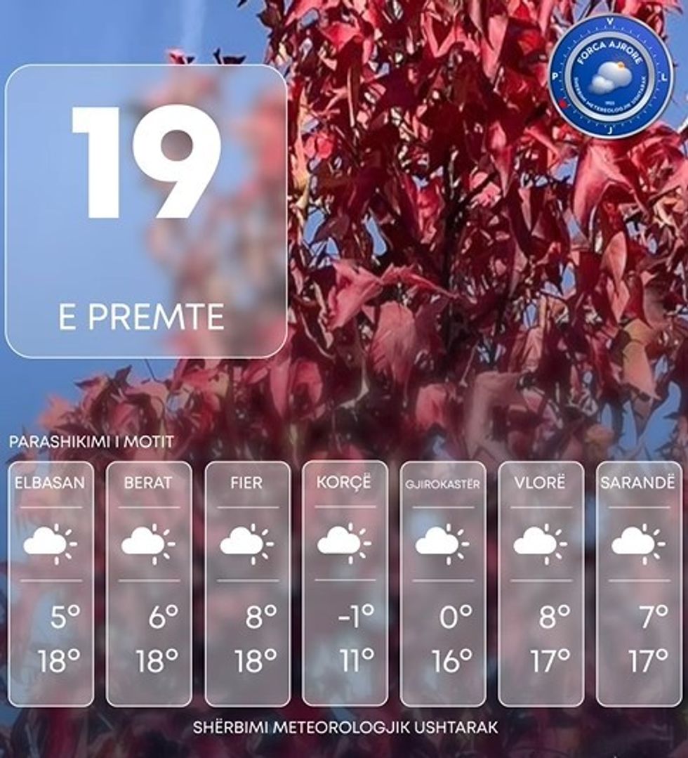 Shërbimi Meteorologjik Ushtarak bën të ditur se Shqipëria të premten do të ndikohet nga kushte atmosferike të kryesisht të qëndrueshme.
