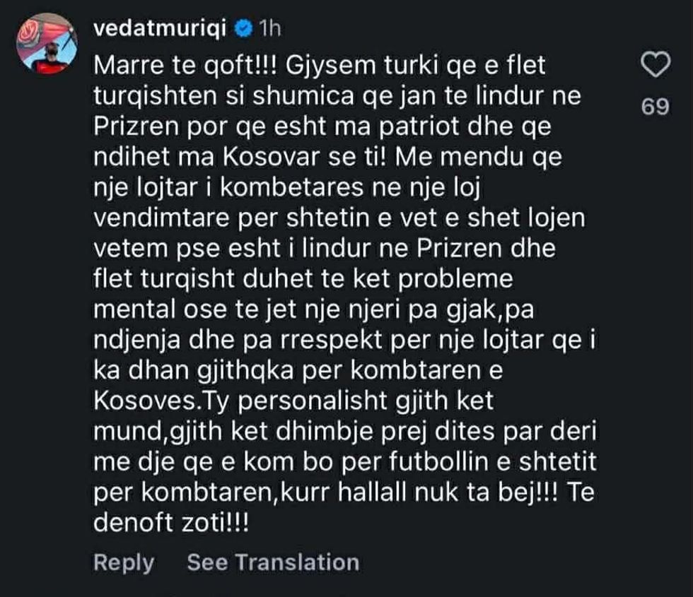 “Marrë të qoftë! ‘Gjysem turk’ që e flet turqishten, si shumica që janë të lindur në Prizren, por që është më patriot dhe ndihet më Kosovar se ti! Të mendosh se një lojtar i kombëtares, në një ndeshje vendimtare për shtetin e vet, e shet lojën vetëm pse është i lindur në Prizren dhe flet turqisht, tregon ose probleme mendore, ose që je një njeri pa ndjenja, pa gjak dhe pa respekt për një lojtar që i ka dhënë gjithçka kombëtares së Kosovës”.