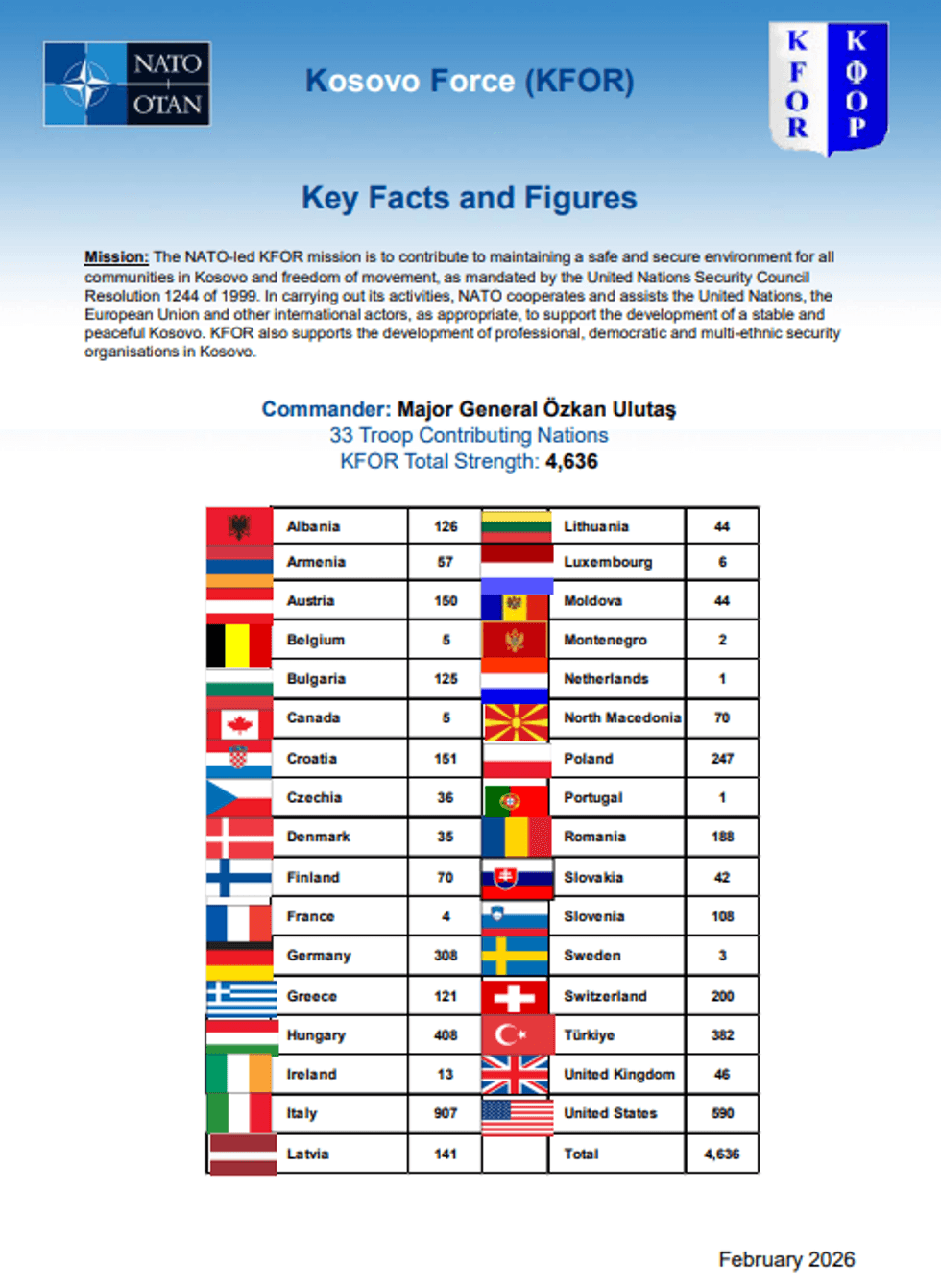 Italia, Shtetet e Bashkuara të Amerikës, Hungaria, Turqia dhe Polonia kanë numrin më të madh të personelit ushtarak në kuadër të misionit të KFOR-it në Kosovë.