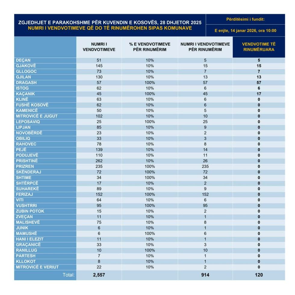 Nga fillimi i këtij procesi (e martë, 13 janar 2026, ora 18:00) dhe deri më tani (e enjte, 15 janar 2026, ora 10:00) janë rinumëruar 120 nga 914 vendvotime, të cilat u takojnë komunave të ndryshme, si: Deçan (5), Gjakovë (15), Gllogoc (7), Gjilan (13), Dragash (57), Istog (6) dhe Kaçanik (17).