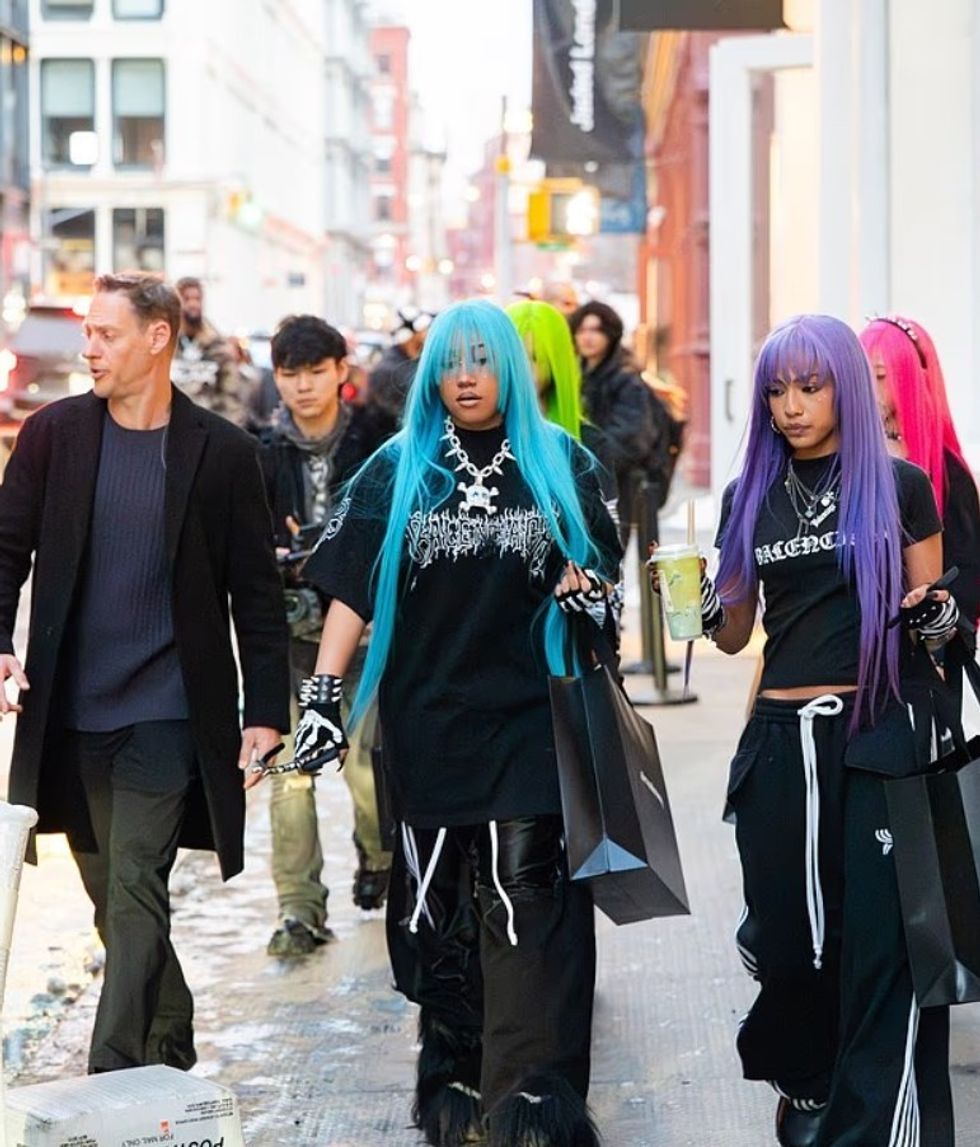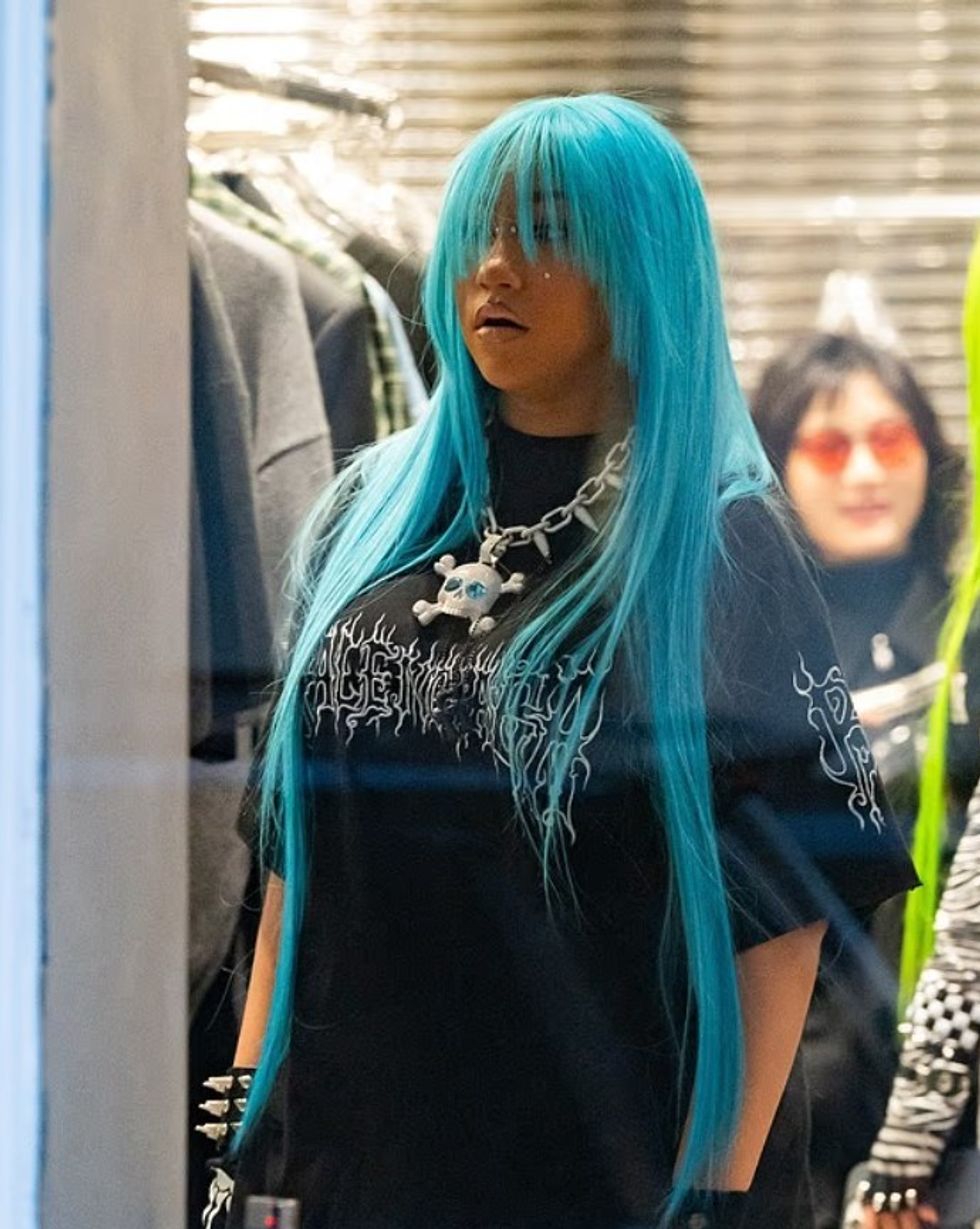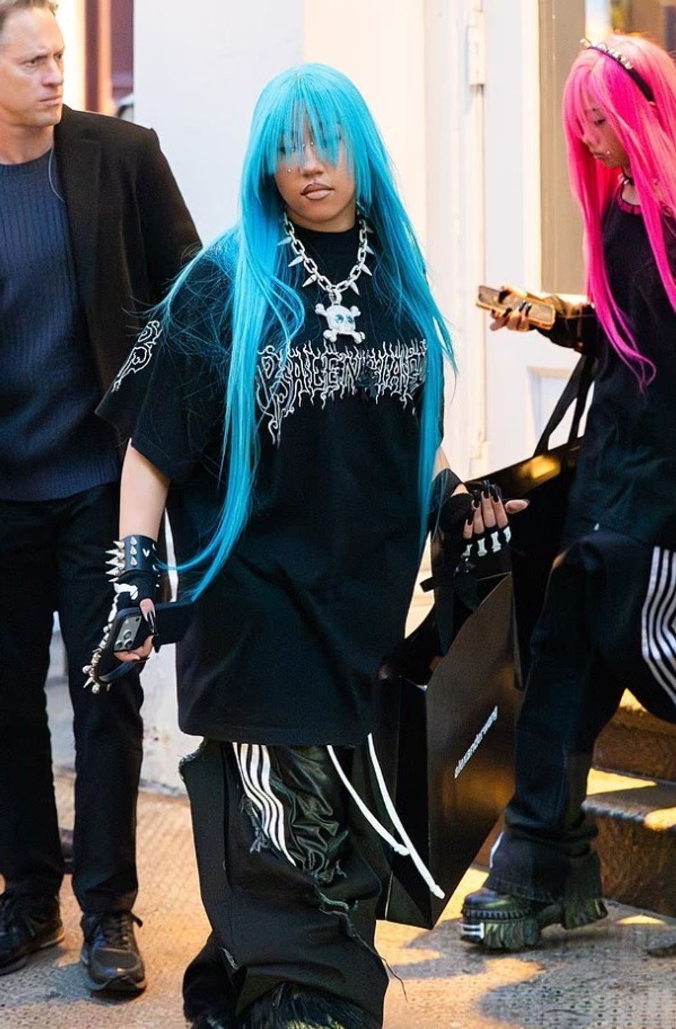 Ndërkohë, North u fotografua duke shfaqur stilin e saj personal në Soho, New York, me bluzë të gjerë Balenciaga, pantallona sportive dhe çizme dimërore të zeza, ndërsa flokët e saj të gjatë blu neoni i rrokullisnin balluket mbi sy. /Telegrafi/